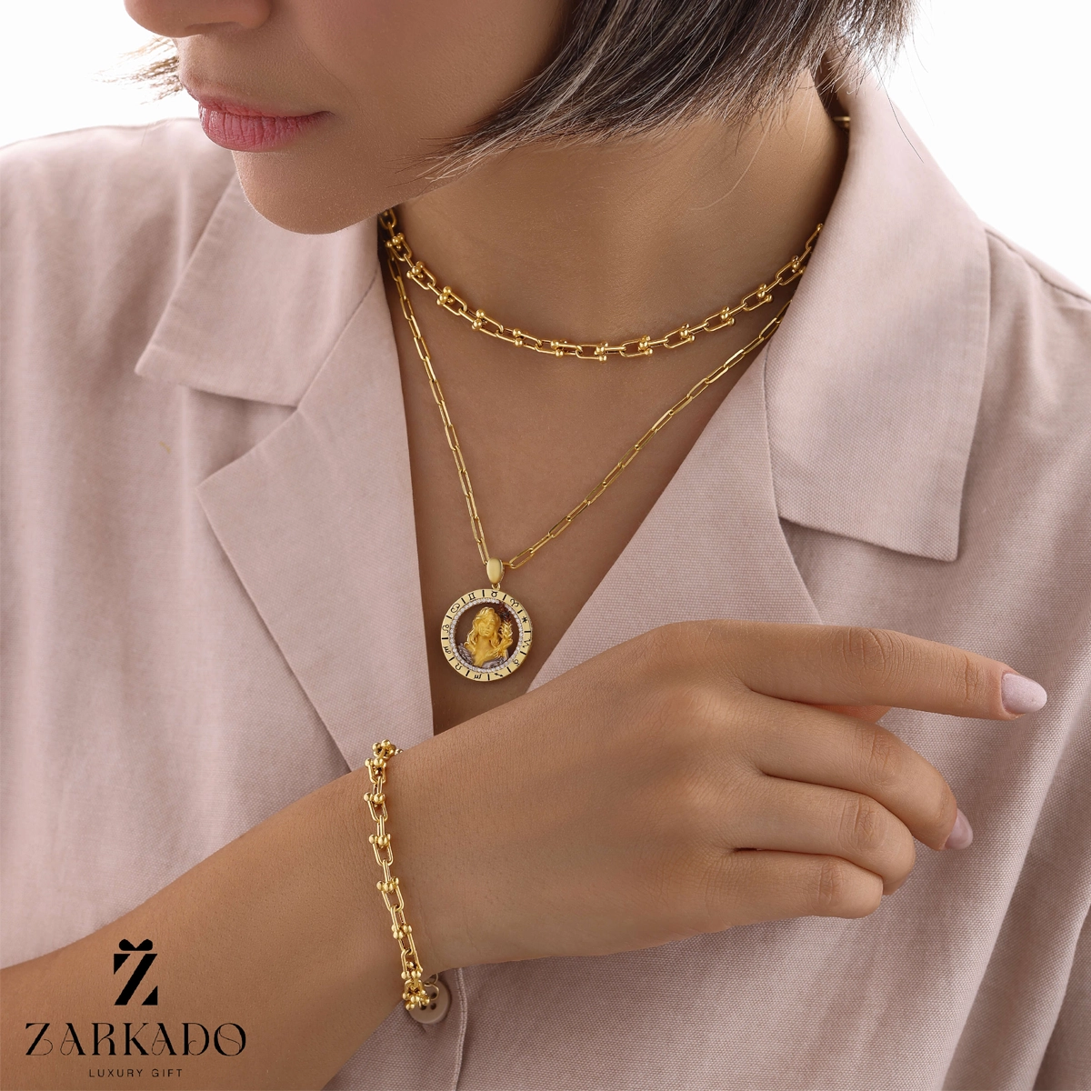 • در حاشیه بیرونی پلاک، نمادهای مرتبط با صور فلکی بهصورت حکاکیشده روی سطح طلا دیده میشوند که این پلاک طلا را به یک زیور نمادین و متفاوت تبدیل کرده است ✨