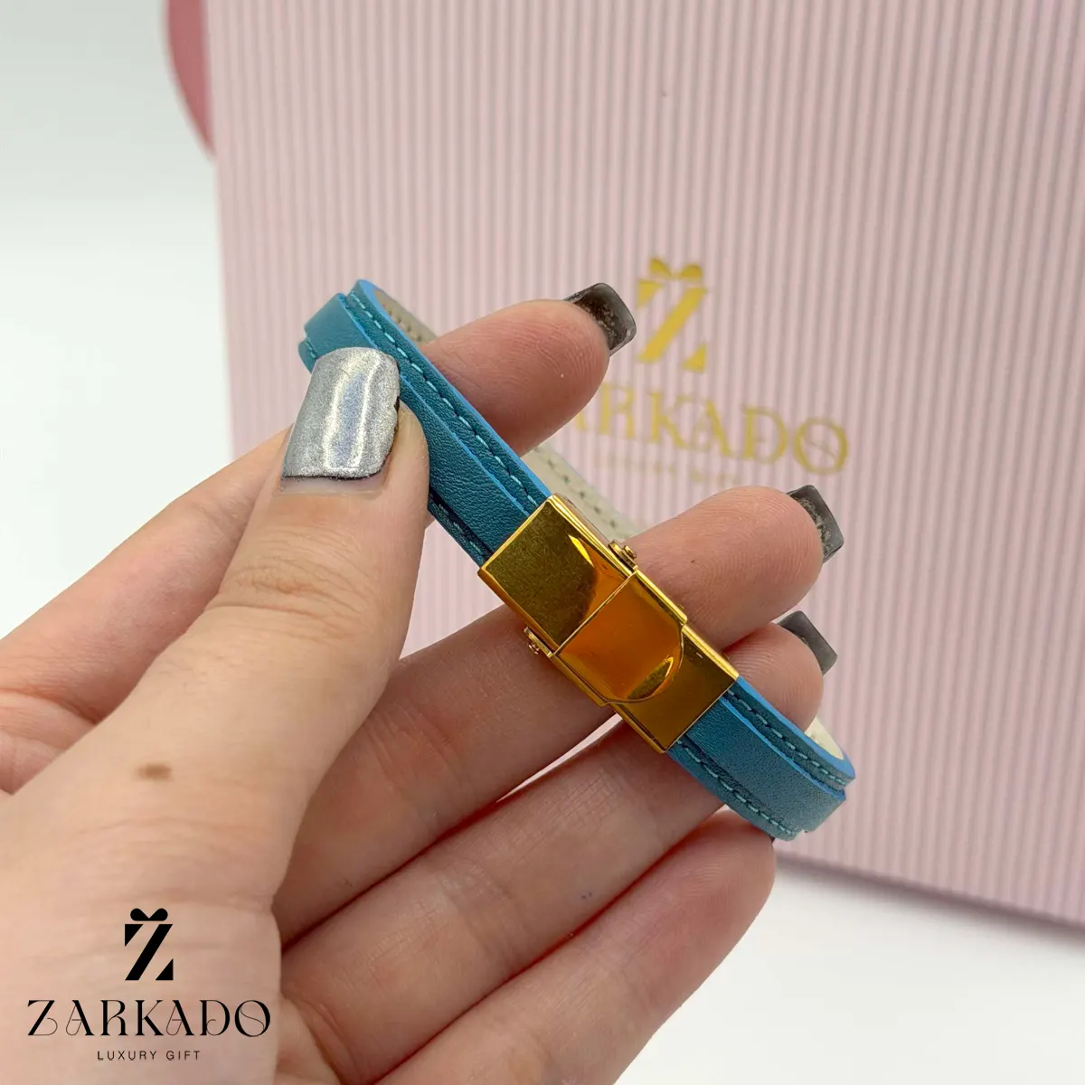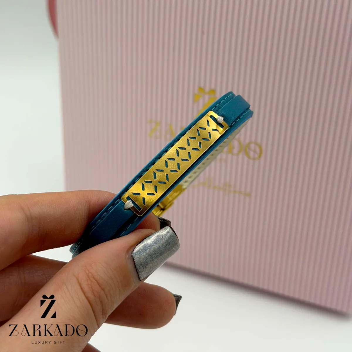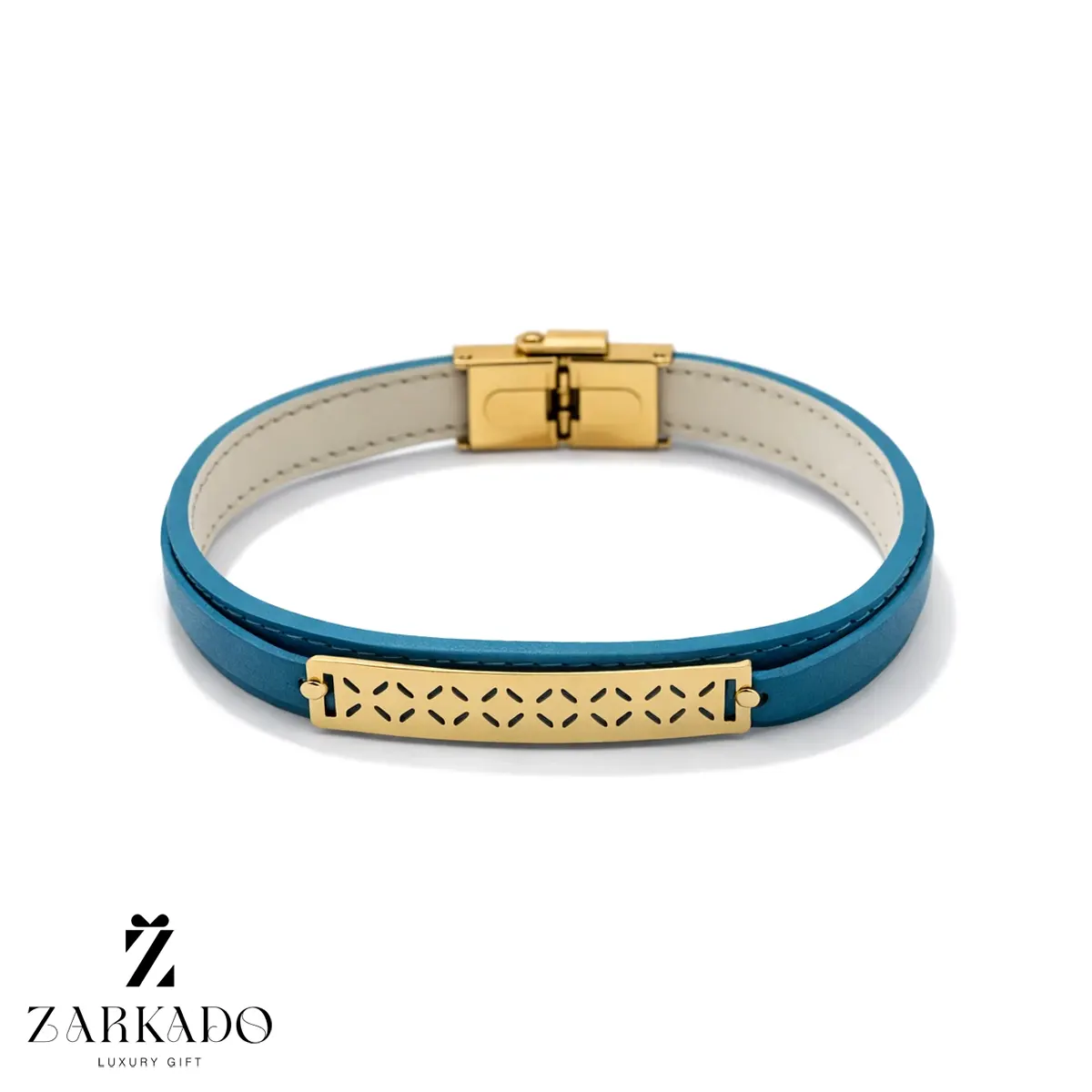 این دستبند با بند چرمی آبی شفاف و پلاک طلای ۱۸ عیار، ترکیبی شیک از مدرنیته و اصالت به همراه دارد.