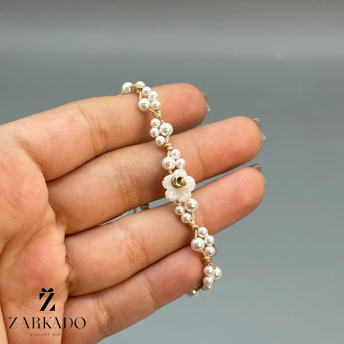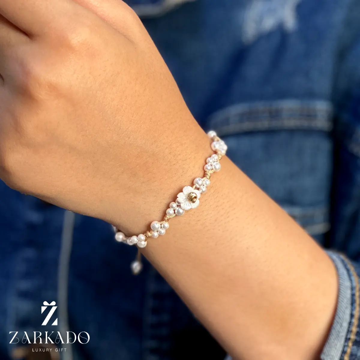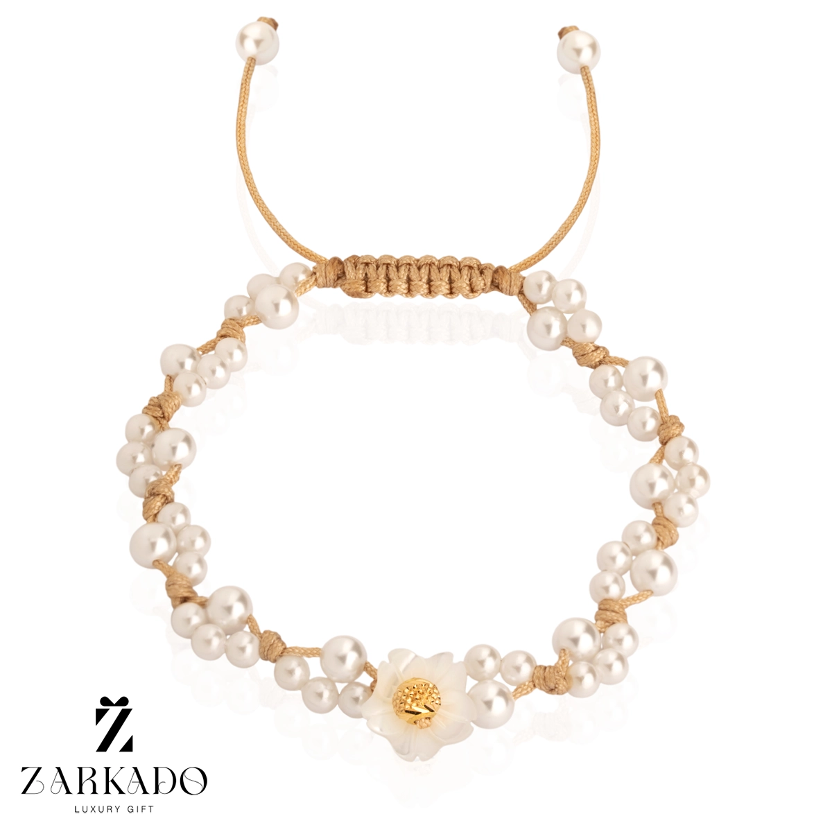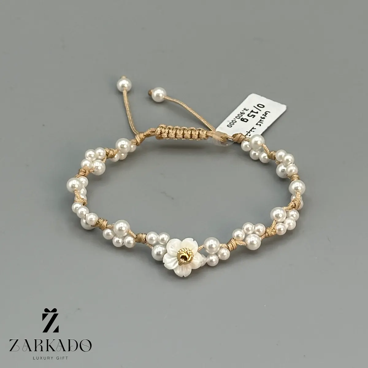 دستبند طلا و مروارید با صدف گل و گوی چکشی