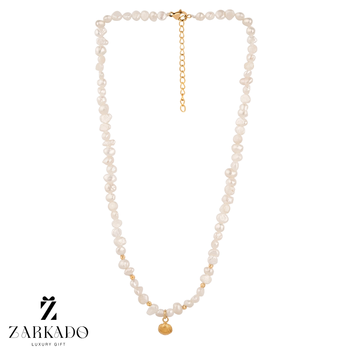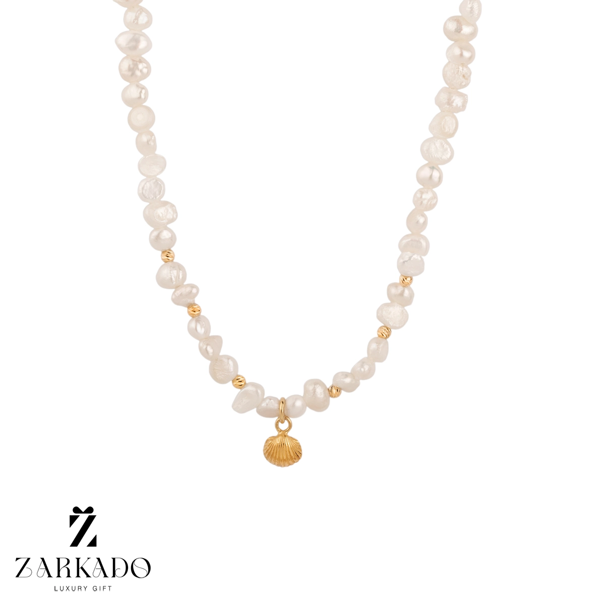 آویز صدف و گویهای طلای درخشان میان مرواریدها جلوهای ظریف و لوکس به آن دادهاند.