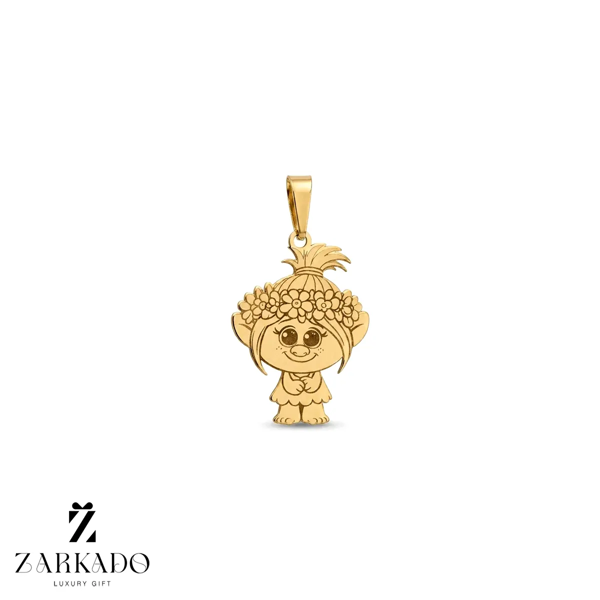 این محصول یک پلاک طلا با طراحی تخت و اجرای کاملاً یکدست است که شخصیت کارتونی بهصورت دقیق روی سطح آن حکاکی شده و جزئیات چهره، مو و تاج گل با وضوح بالا دیده میشود ✨