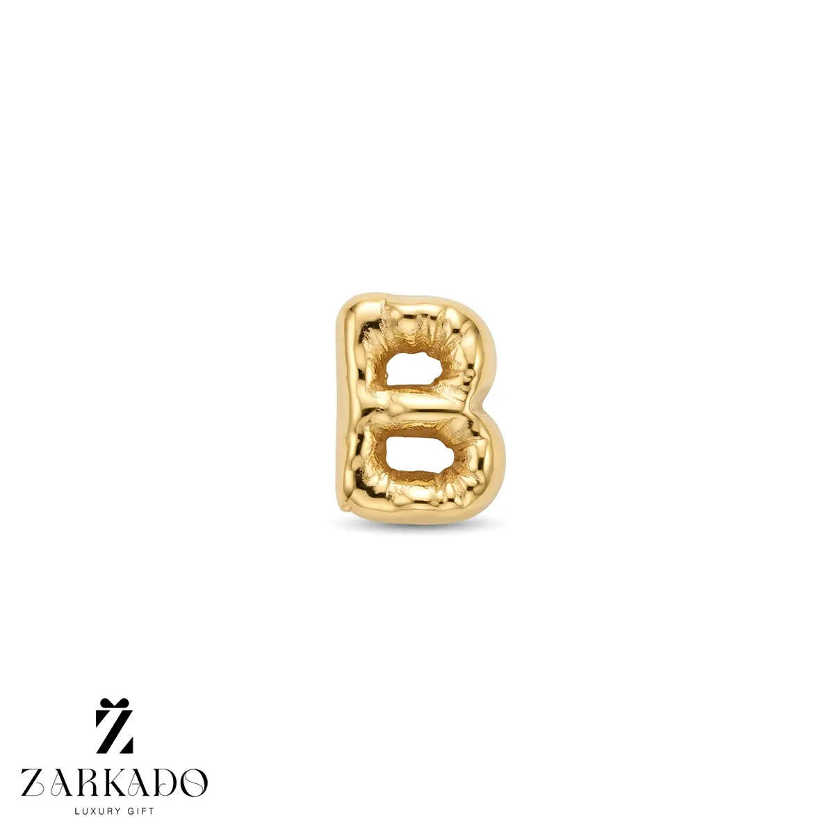 • این پلاک طلا با فرم حرف B و طراحی بادکنکی ساخته شده است؛ ساختاری حجمی با لبههای گرد و فرم نرم که ظاهر آن از سبک حروف بادکنکی در طراحی مدرن زیورآلات طلا الهام گرفته شده است ✨