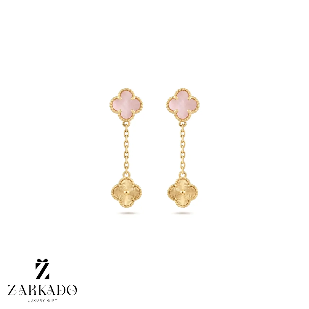 • این گوشواره زنانه با الهام از طراحی ونکلیف ساخته شده و در بخش بالایی دارای فرم گل چهارپر است که با سنگ کریستالی صورتی پوشانده شده و جلوهای ظریف و کلاسیک ایجاد میکند ✨