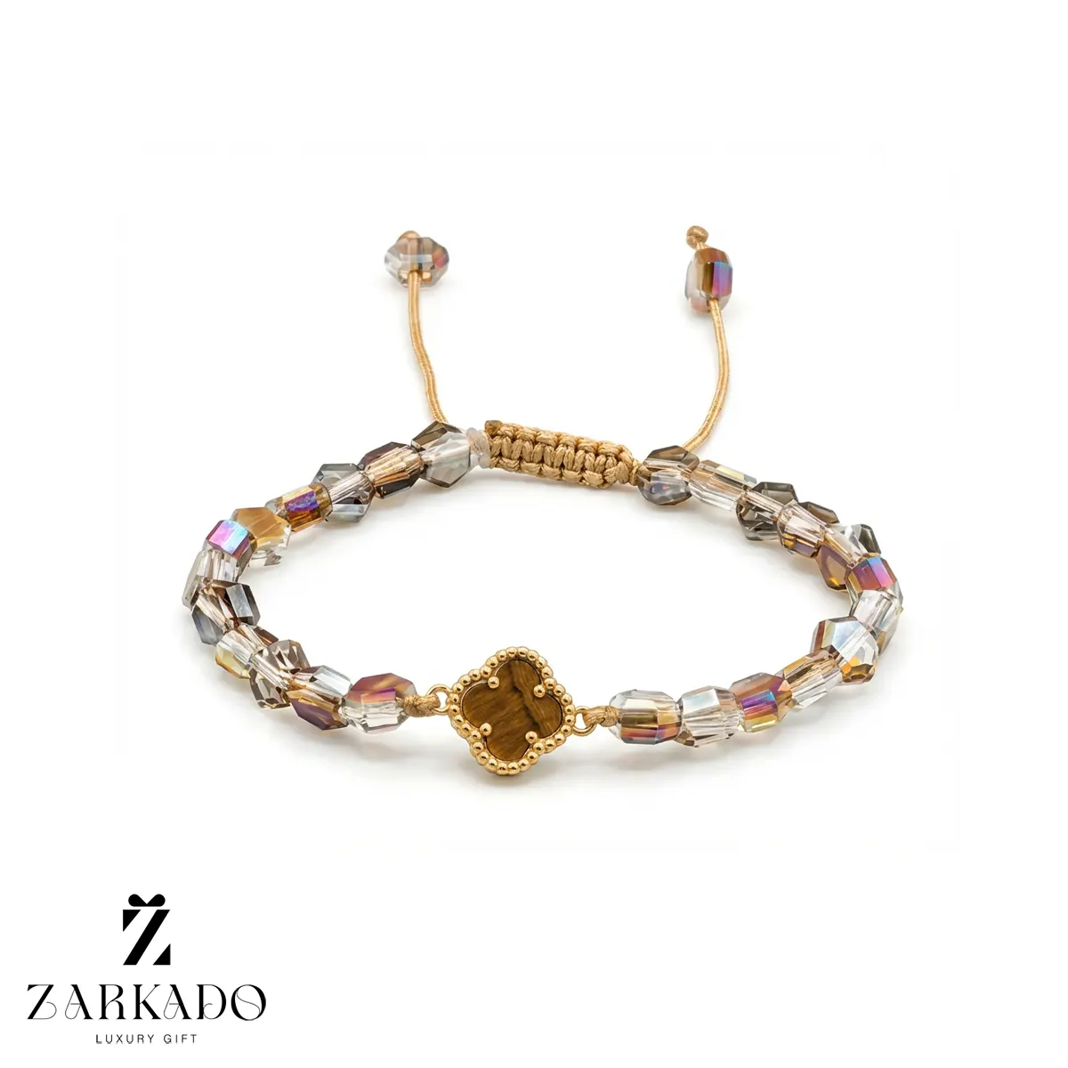 • مهرههای کریستالی در دو سمت پلاک بهصورت متقارن چیدمان شدهاند و با طیف رنگی شفاف و درخشان، جلوهای ظریف و هماهنگ در ساختار دستبند ایجاد میکنند 💍