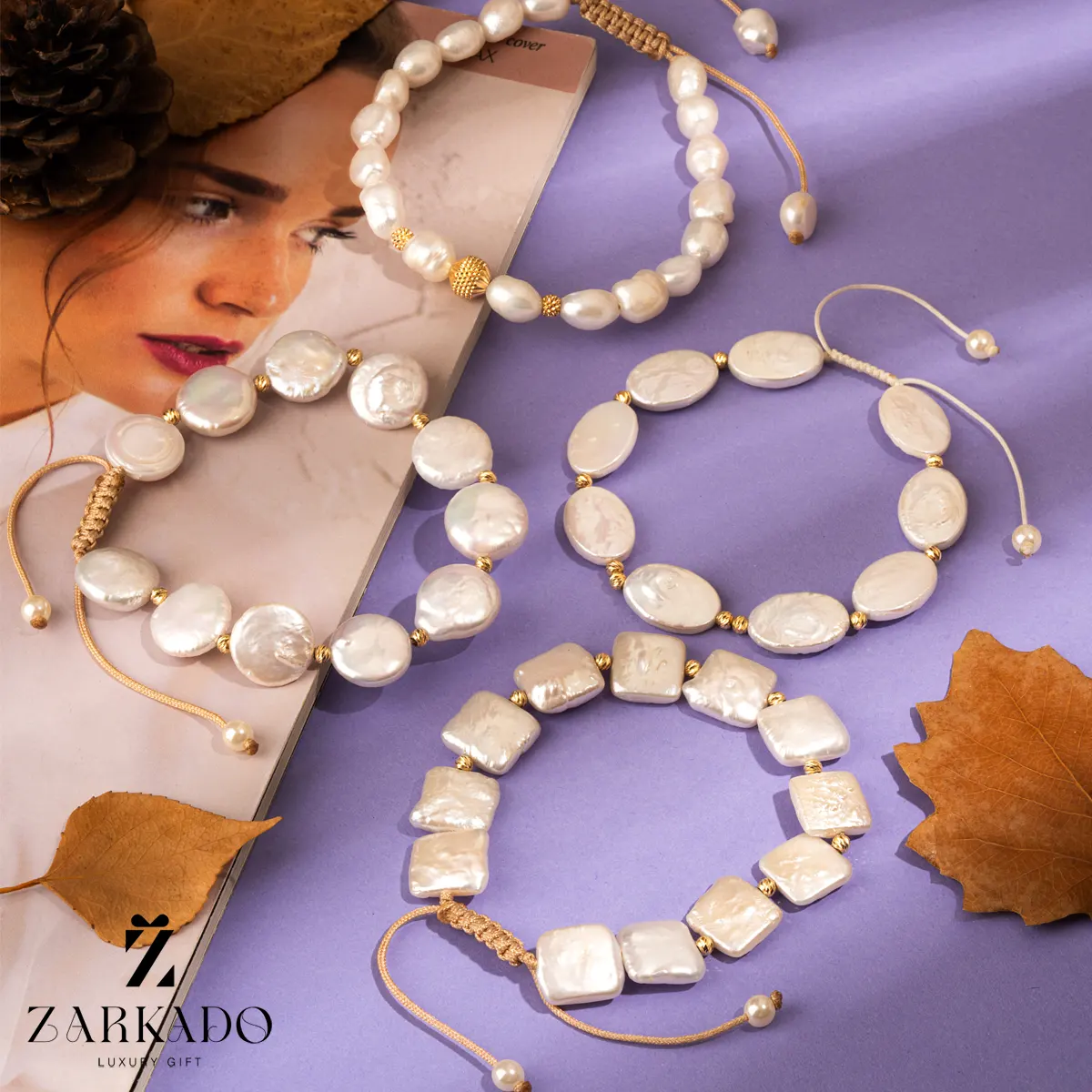 این دستبندهای دستساز از مرواریدهای باروک پرورشی ساخته شدهاند و با نخ ظریف کنار هم قرار گرفتهاند.