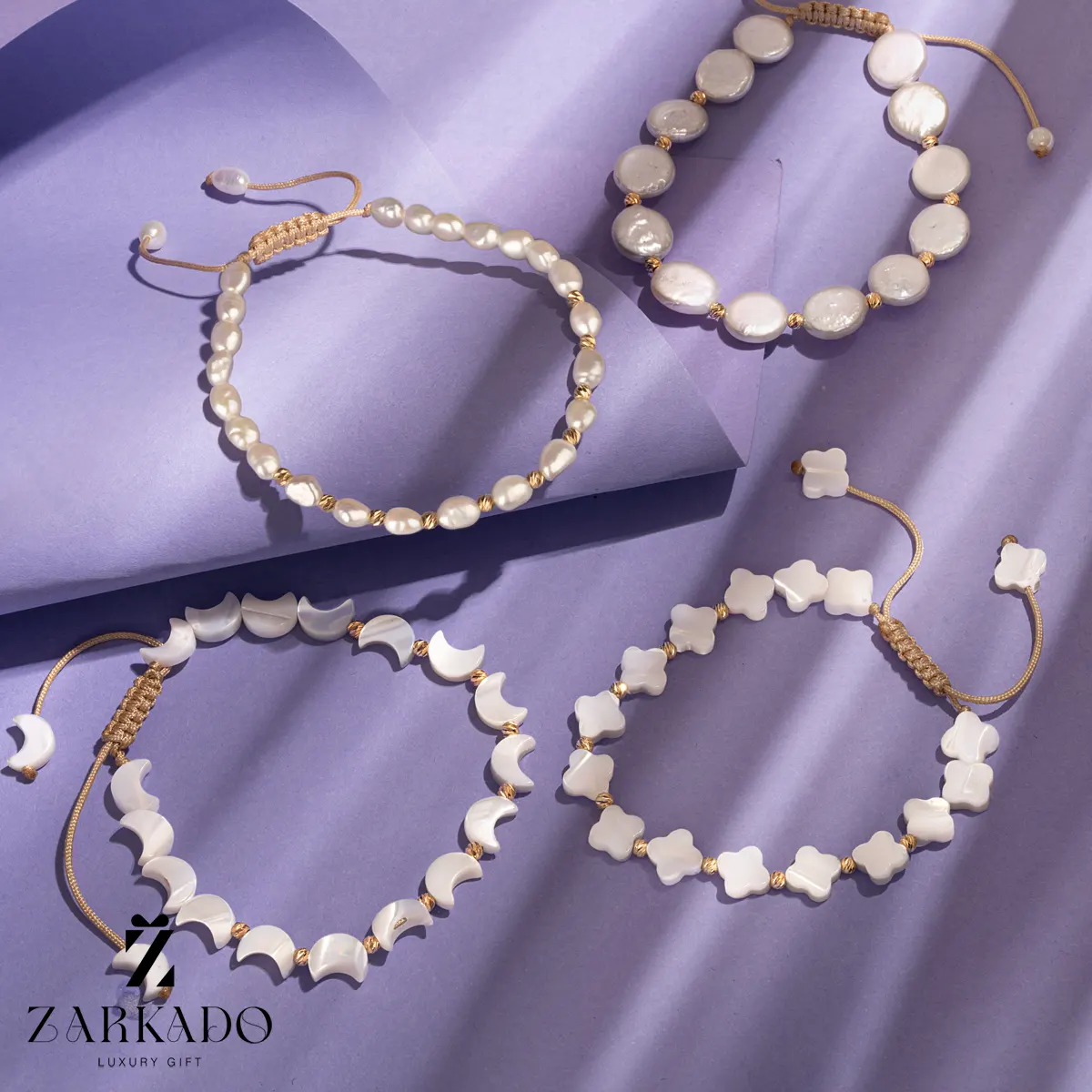 این دستبندهای دستساز از مرواریدهای باروک پرورشی ساخته شدهاند و با نخ ظریف کنار هم قرار گرفتهاند.