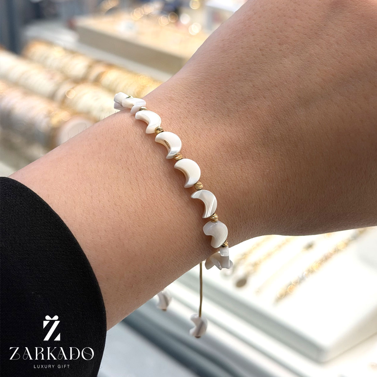 • ترکیب سنگ صدف با طراحی ماه و گویهای طلا، این دستبند را به گزینهای مناسب برای هدیه و همچنین استفاده روزمره در کنار سایر زیورآلات طلا تبدیل کرده است 💍
