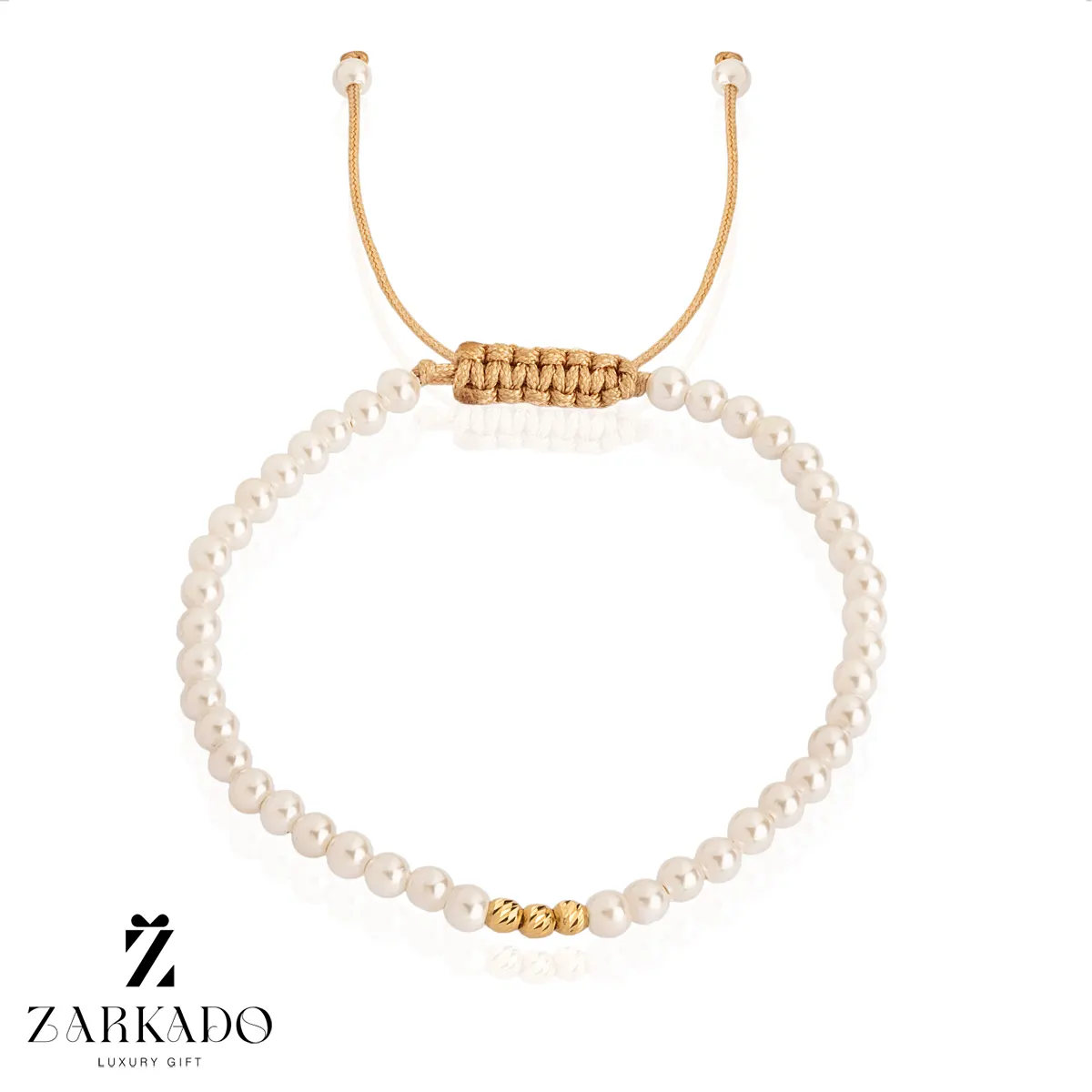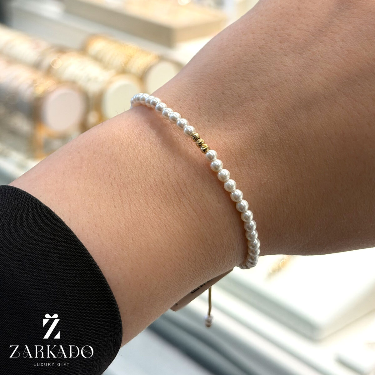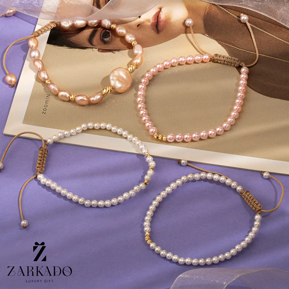 این دستبندهای دستساز از مرواریدهای غیراصل ریز ساخته شدهاند و با نخ ظریف کنار هم قرار گرفتهاند.