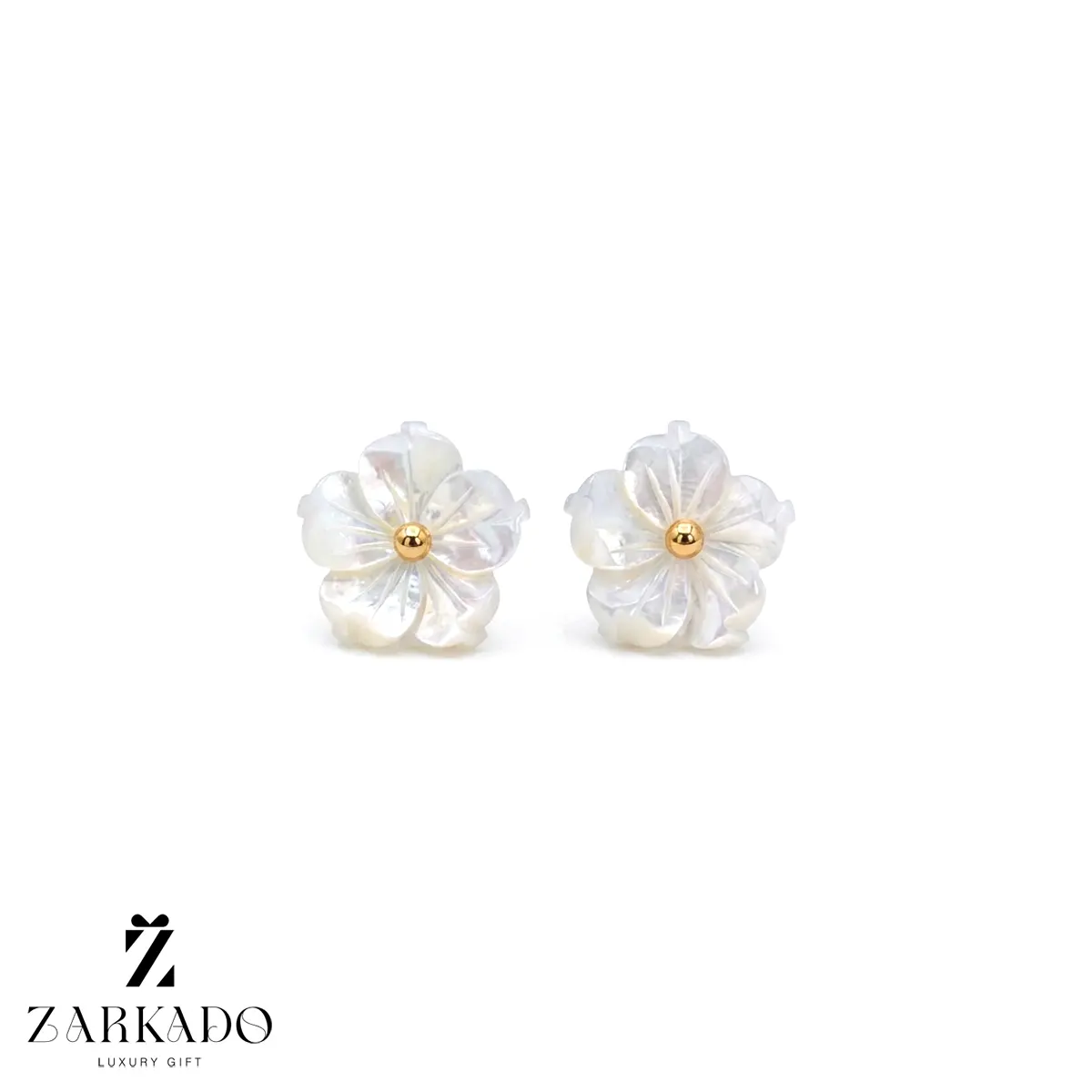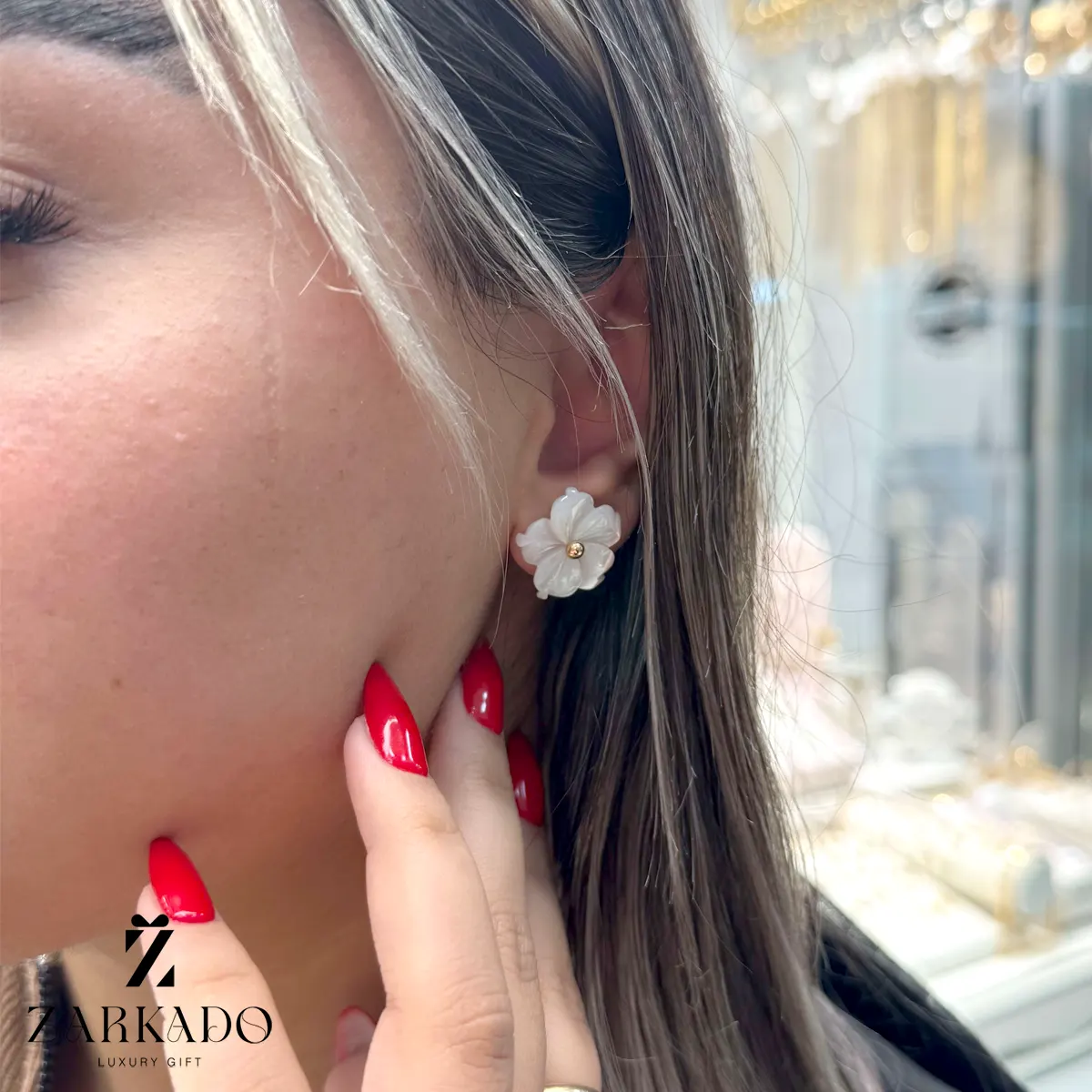 • بدنه اصلی گوشواره از صدف سفید تراشخورده ساخته شده که به شکل گل چند پر طراحی شده و با سطح براق و طبیعی خود جلوهای لطیف و درخشان روی گوش ایجاد میکند 💍