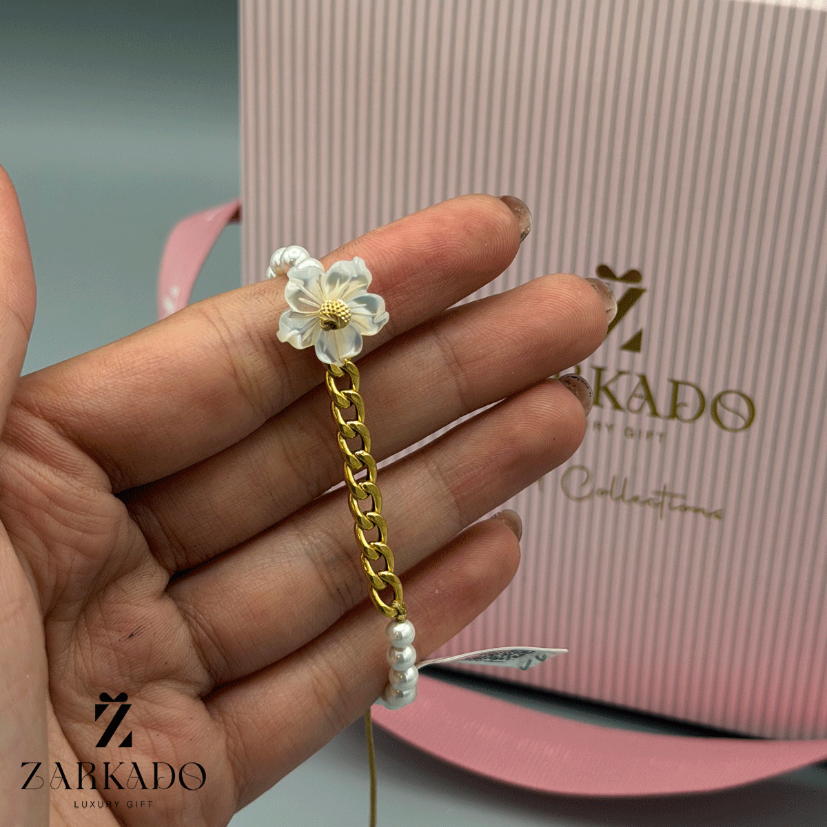 این دستبند تلفیقی از زنجیر کارتیه طلای ۱۸ عیار و ردیف منظم مرواریدهای صیقلی است که نمای ظرافت و جذابیت را بهزیبایی ترکیب کرده است. ✨