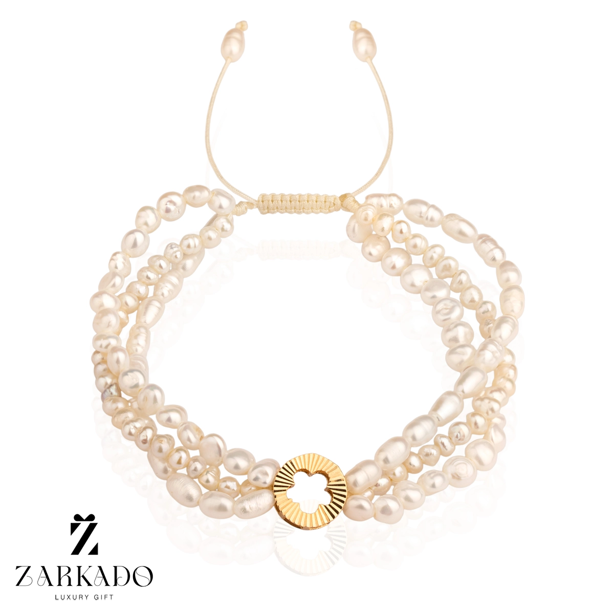 دستبند مرواریدی سه رج و پلاک طلا طرح گل