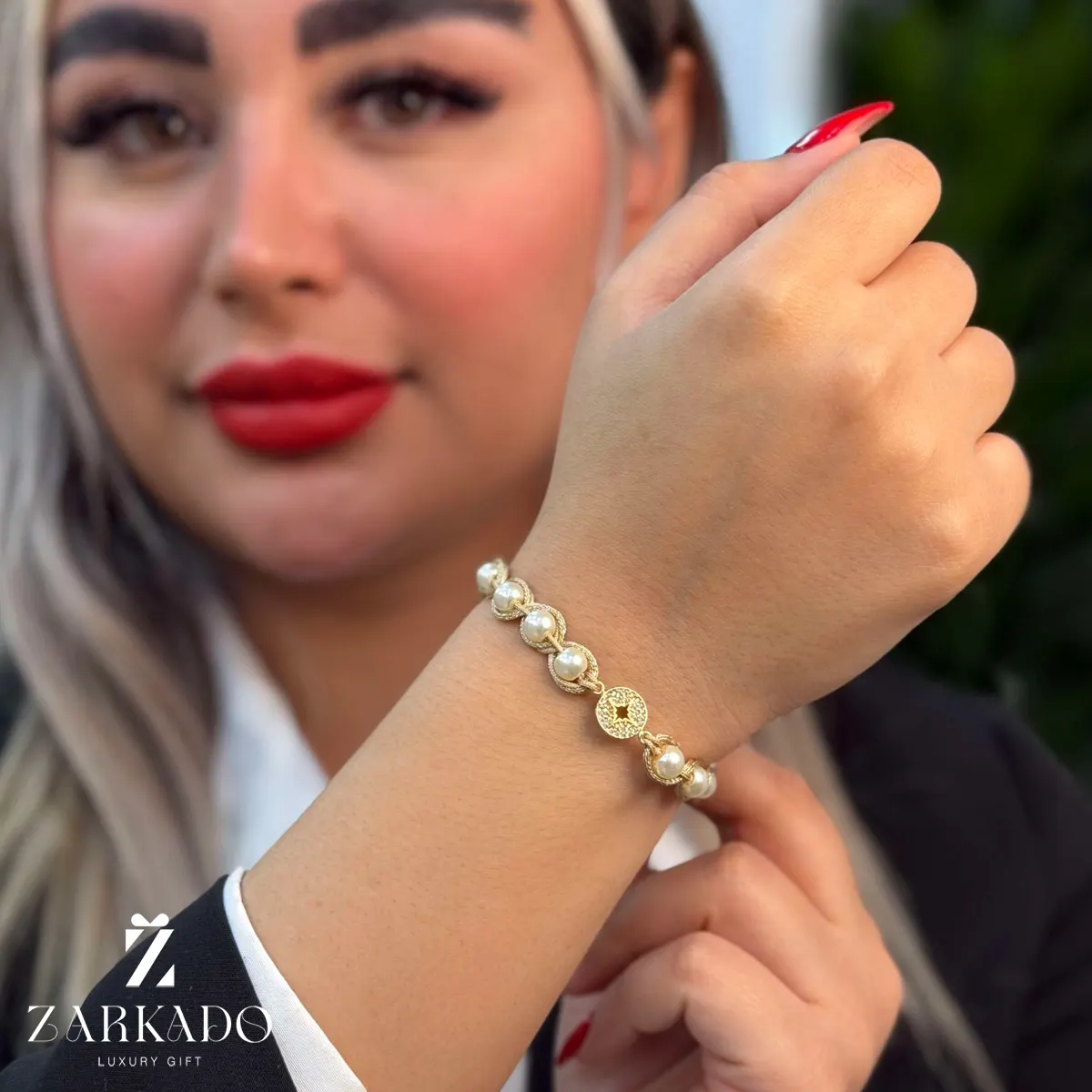 این دستبند زنانه با چیدمان منظم مرواریدهای شِل سفید در قابهای طلایی طراحی شده و جلوهای لطیف، هماهنگ و کاملاً زنانه روی مچ دست ایجاد میکند ✨