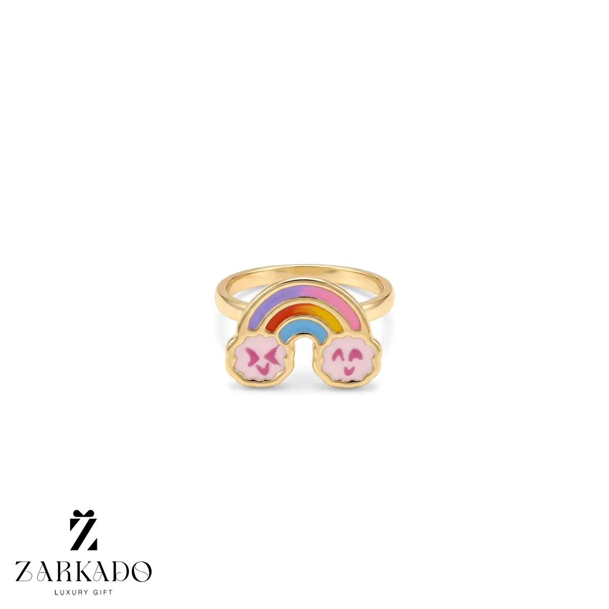 این انگشتر طلا دخترانه با طرح فانتزی رنگینکمان، از طلای زرد ۱۸ عیار ساخته شده و در دسته مدلهای طلا خاص، ترندی و هدیهای قرار میگیرد. رویه انگشتر بهصورت یک فرم قوسی رنگینکمانی طراحی شده که بخش تزئینی آن با میناکاری رنگی چندلایه اجرا شده است. رنگها با تفکیک دقیق و لبهکشی طلایی منظم، جلوهای شفاف و تمیز به ظاهر انگشتر دادهاند. سطح کار کاملاً براق بوده و جزئیات طرح با دقت بالا پرداخت شده است.