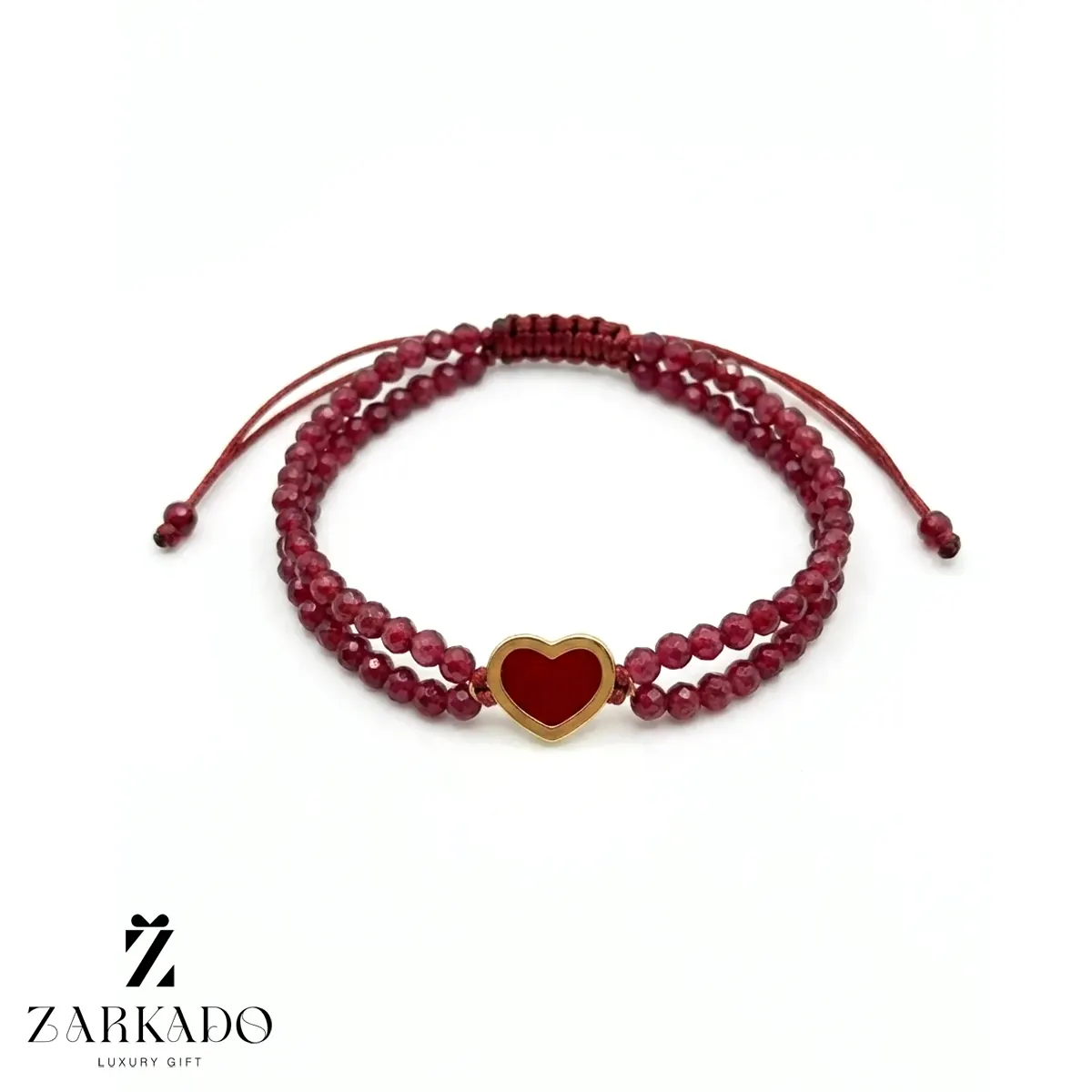 - پلاک مرکزی قلب از طلای ۱۸ عیار ساخته شده و با میناکاری قرمز براق پوشانده شده که هماهنگی کامل و چشمنوازی با رنگ مهرهها به وجود آورده است 💍