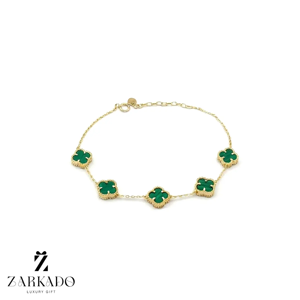 دستبند با زنجیر فلامینگو داری 5 پلاک ونکلیف سنگ دار با سنگ سبز میباشد که جلوه زیبایی به کار میدهد