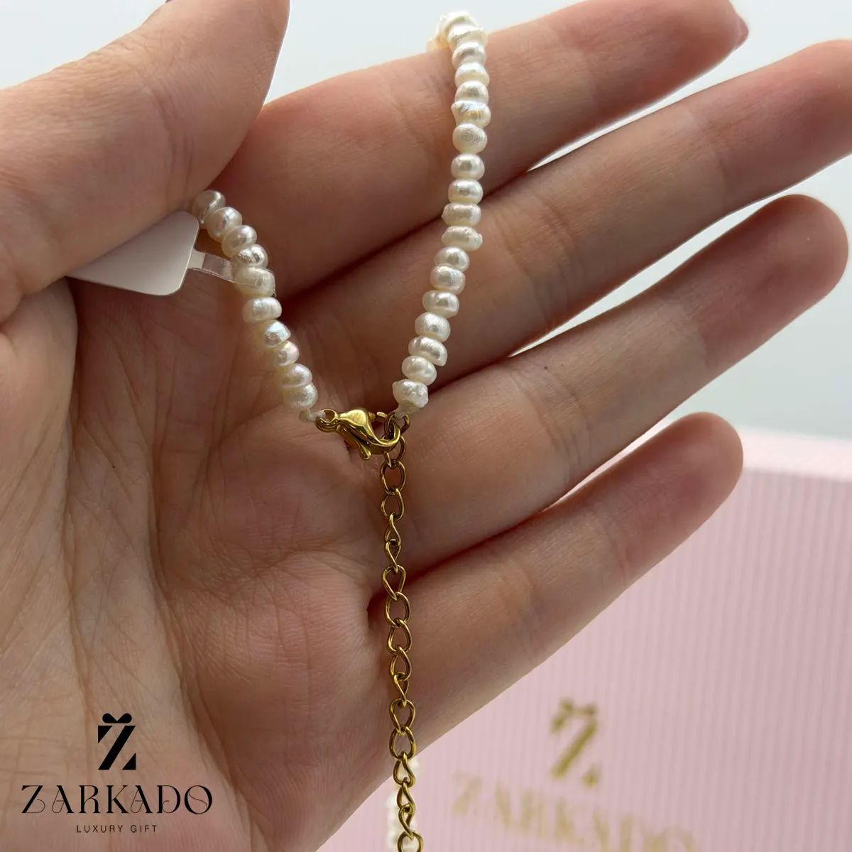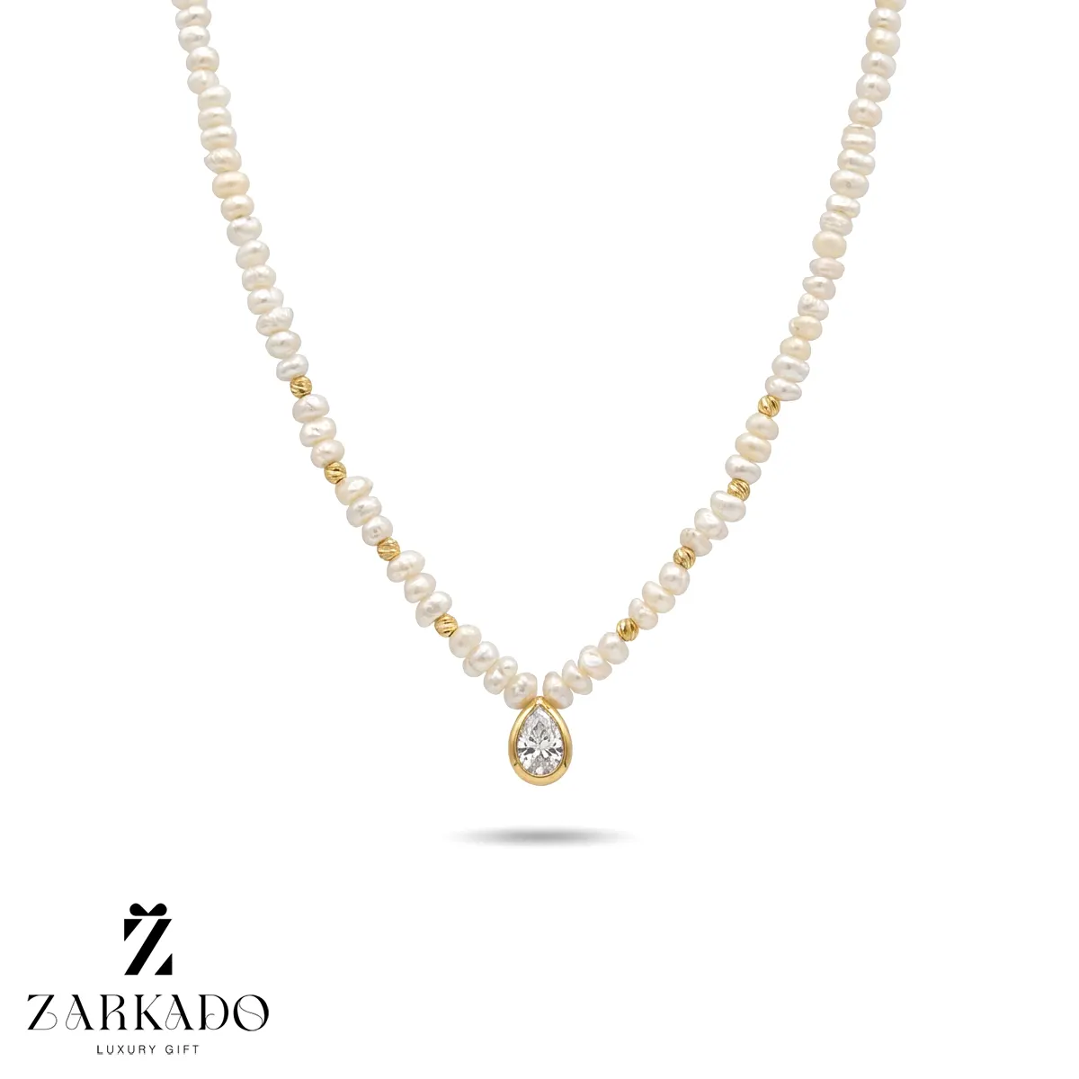 • در فواصل میان مرواریدها قطعات طلایی کروی قرار گرفته که بهعنوان گوی البرنادو شناخته میشوند و بافت درخشان آنها جلوه بصری گردنبند را افزایش داده است 💍