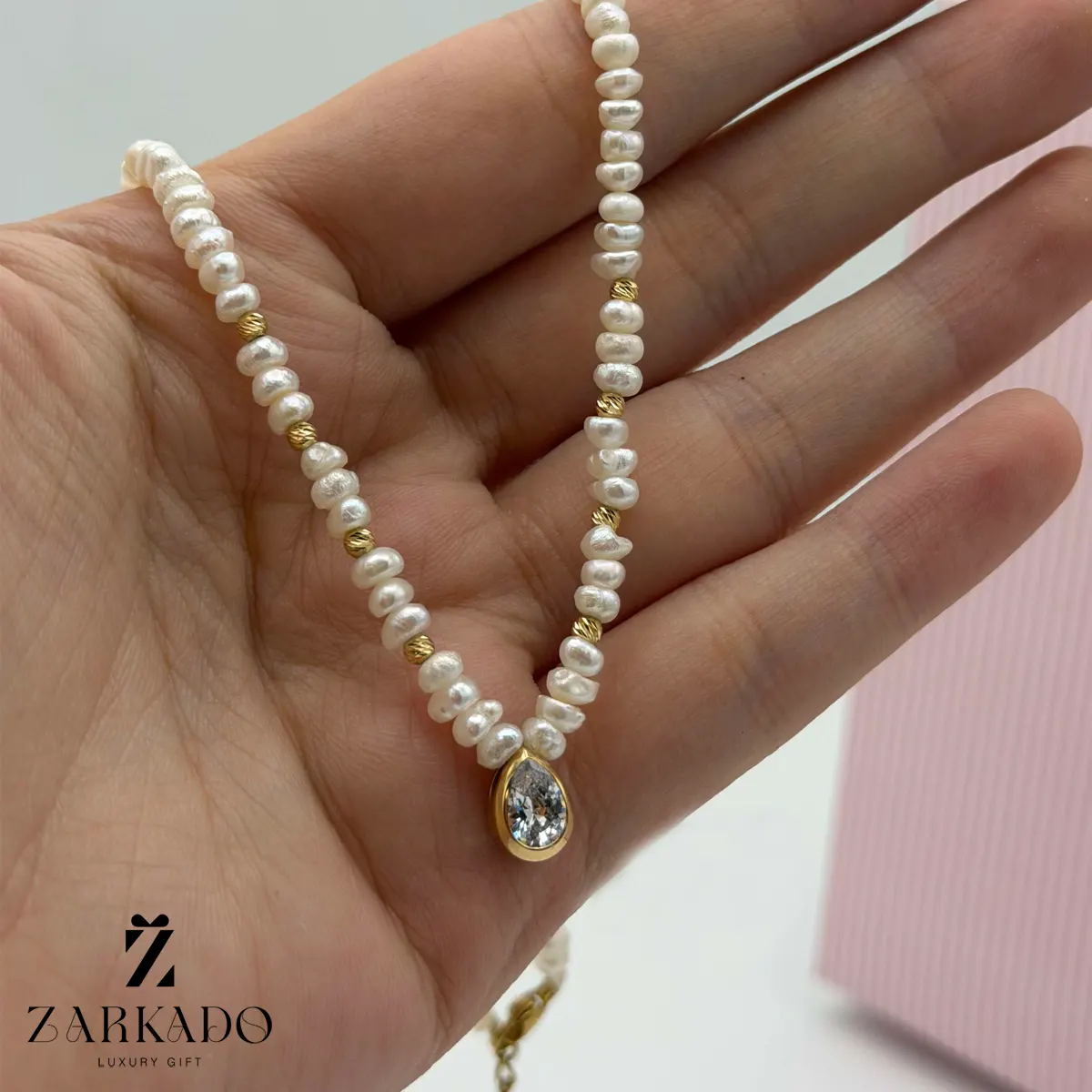 • در بخش مرکزی گردنبند یک پلاک طلا با فرم اشکی دیده میشود که درون آن نگین شفاف قرار گرفته و در قاب طلایی صیقلی محصور شده است ✨