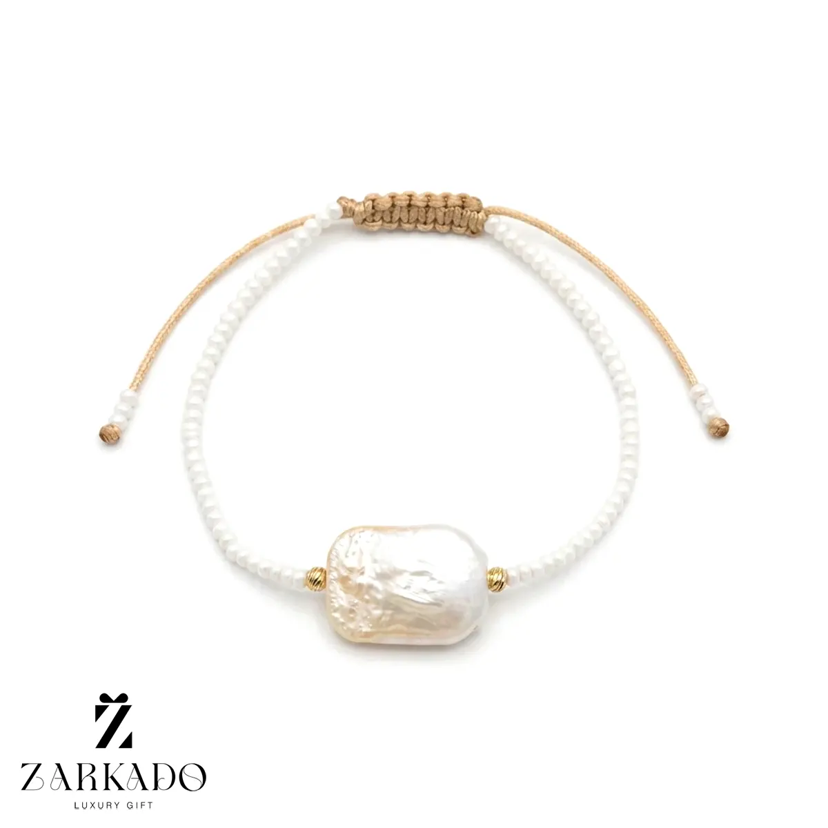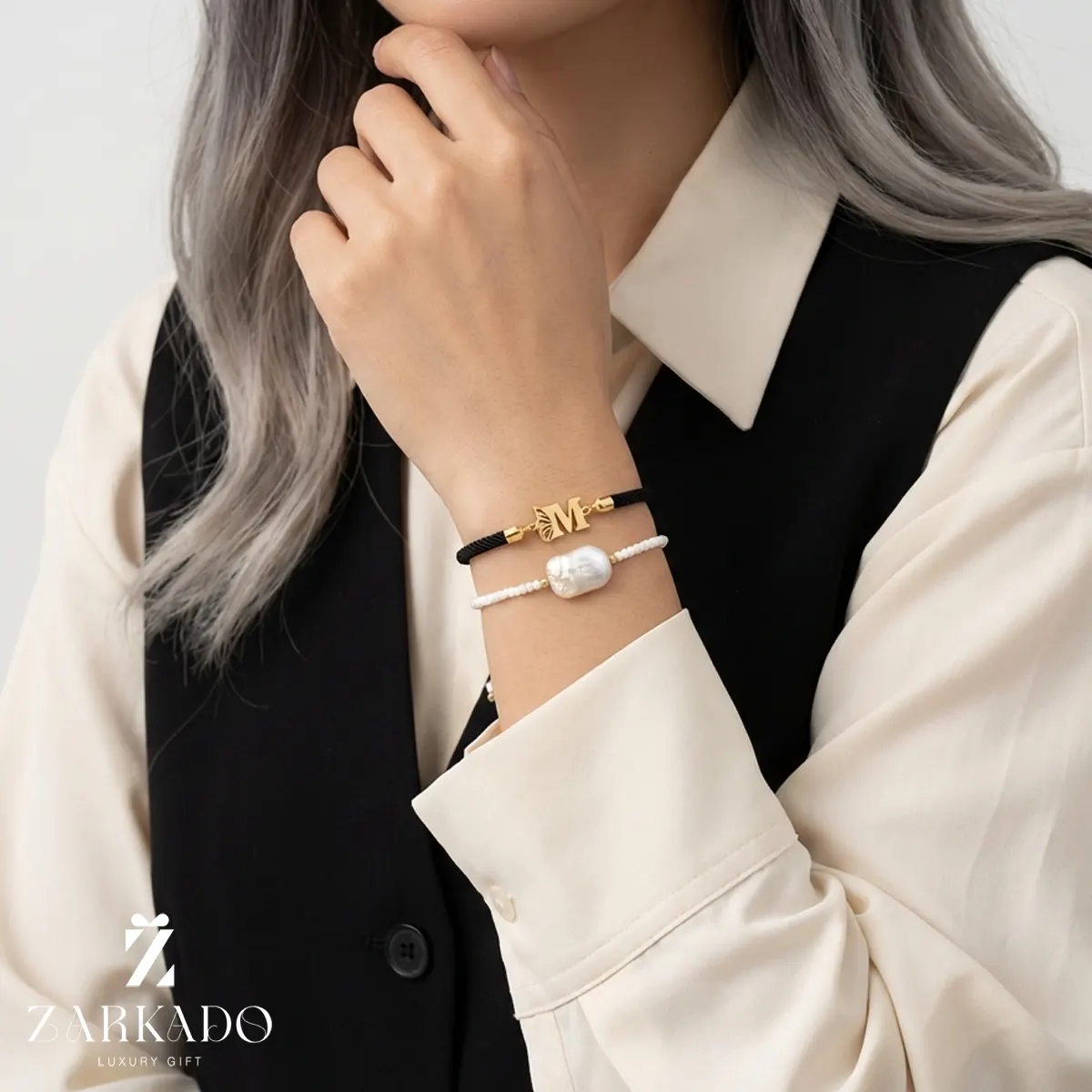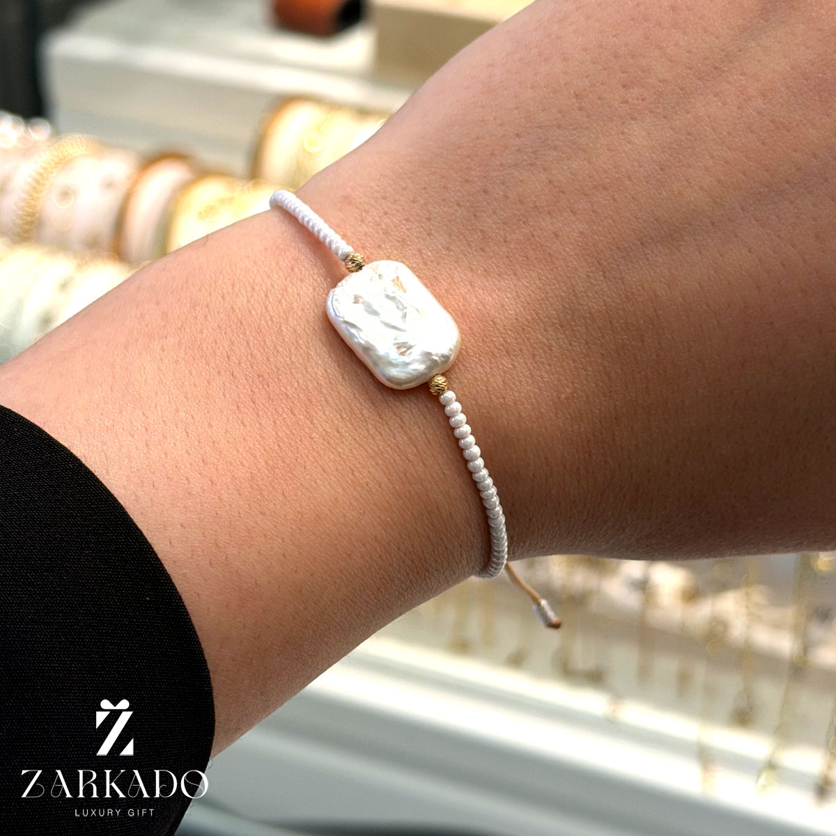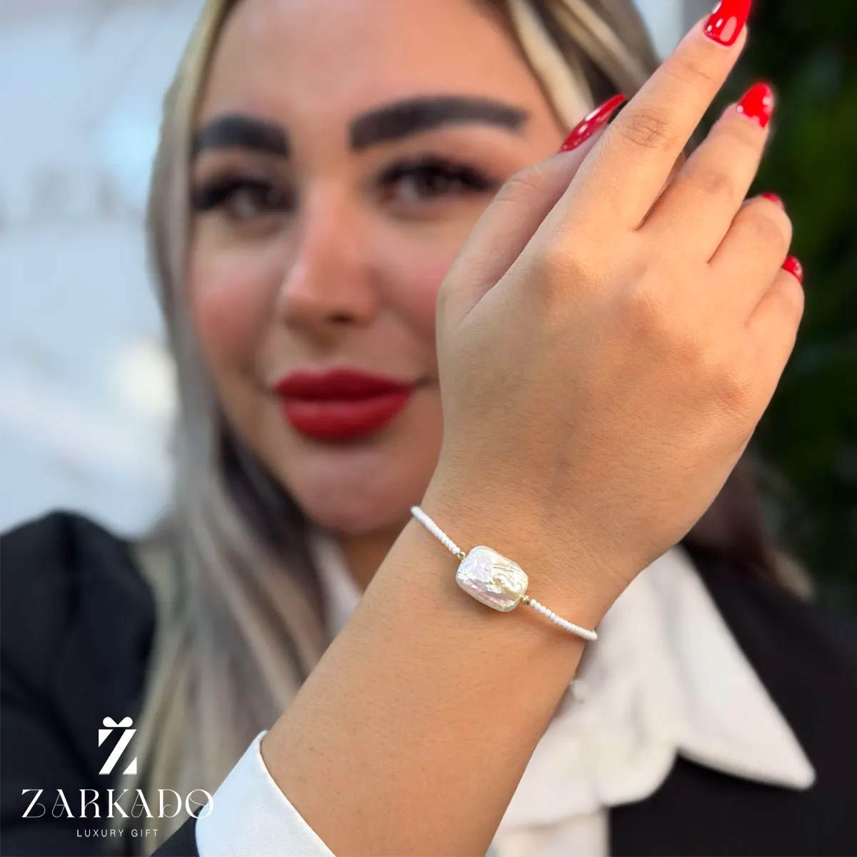 بند دستبند از سنگهای سفید ظریف ساخته شده و در مرکز آن یک مروارید سفید طبیعی قرار دارد که نماد پاکی، آرامش، لطافت و اصالت است. طراحی بند بهصورت قابل تنظیم (گرهای) انجام شده تا بهراحتی روی انواع سایز مچ دست فیکس شود و استفاده روزمره از آن کاملاً راحت باشد.