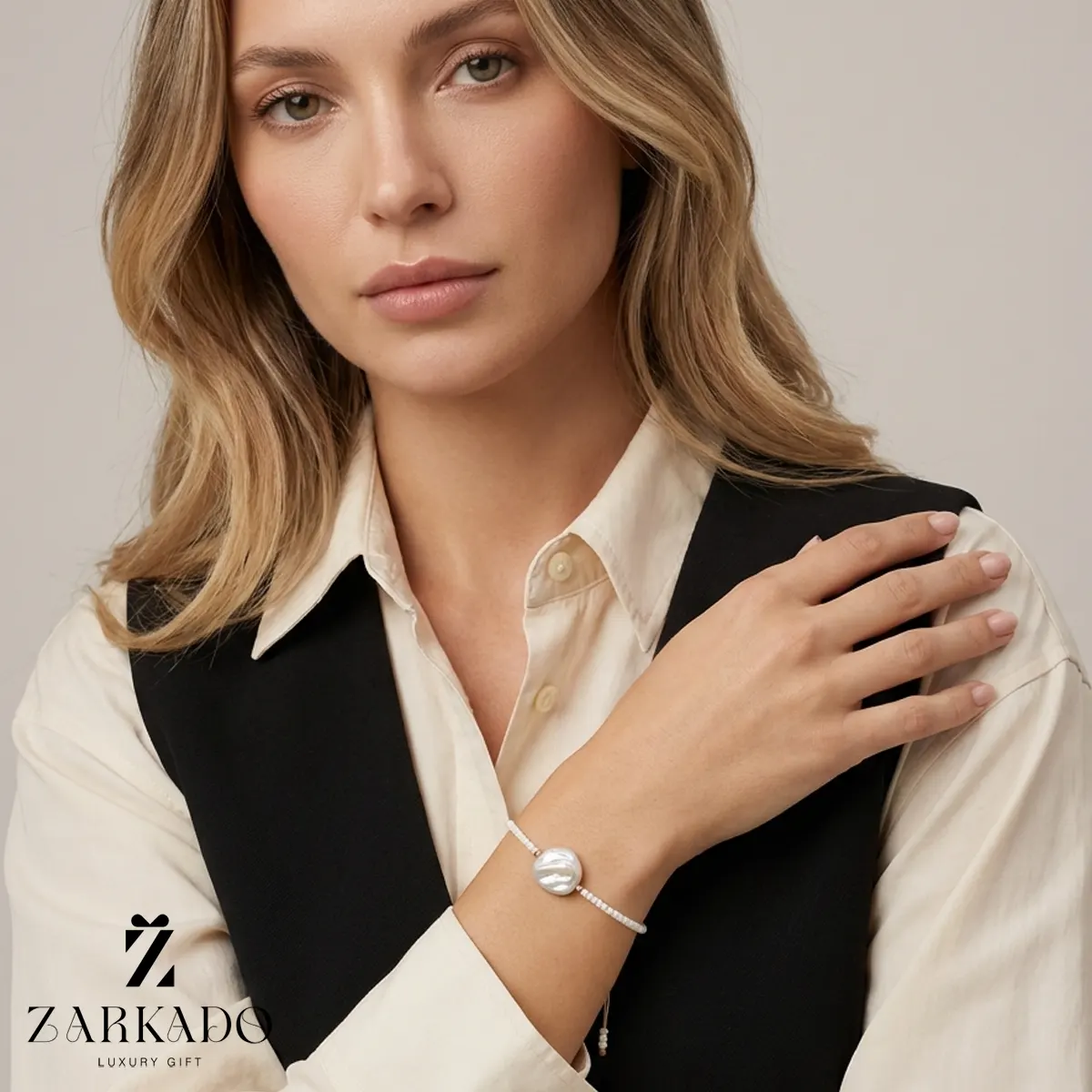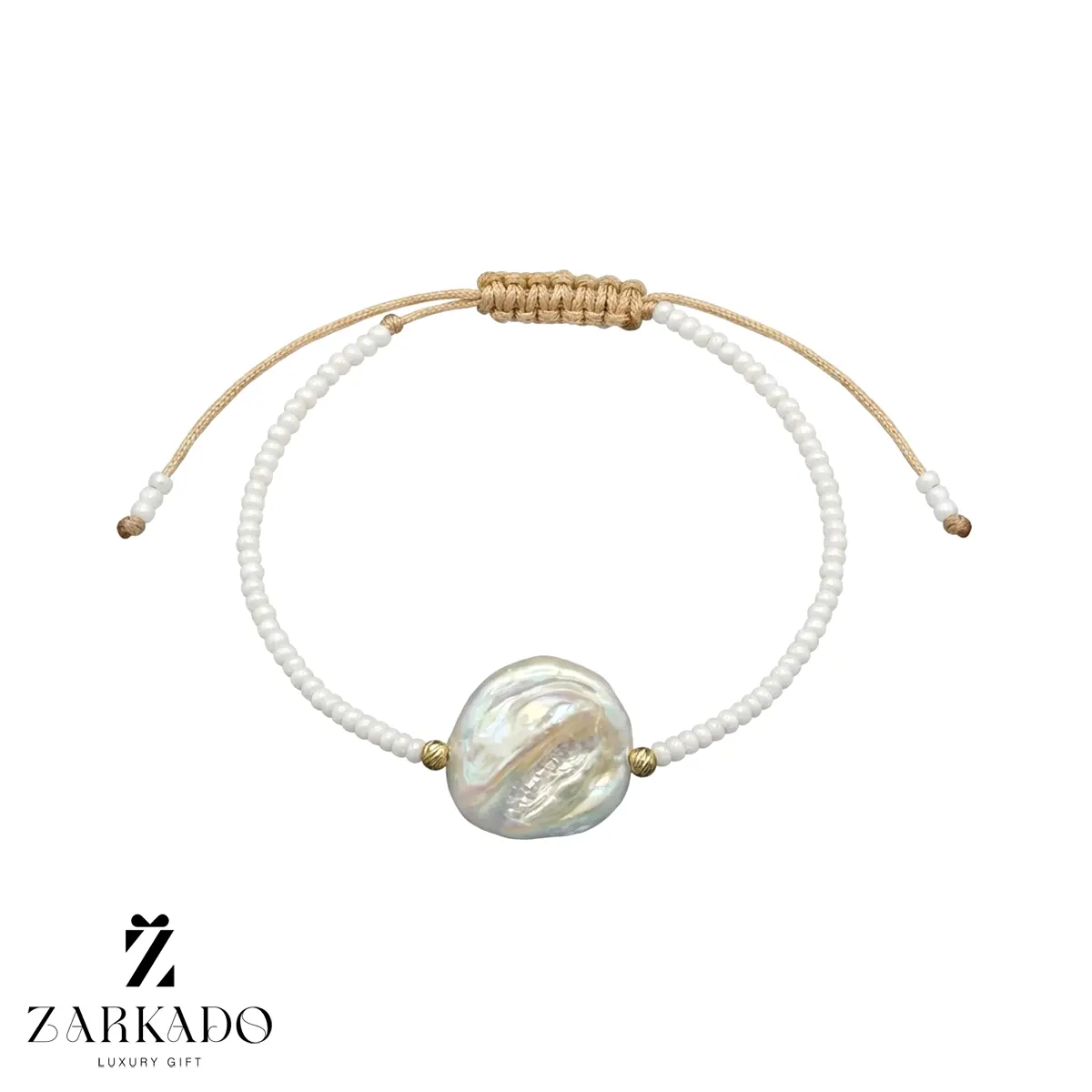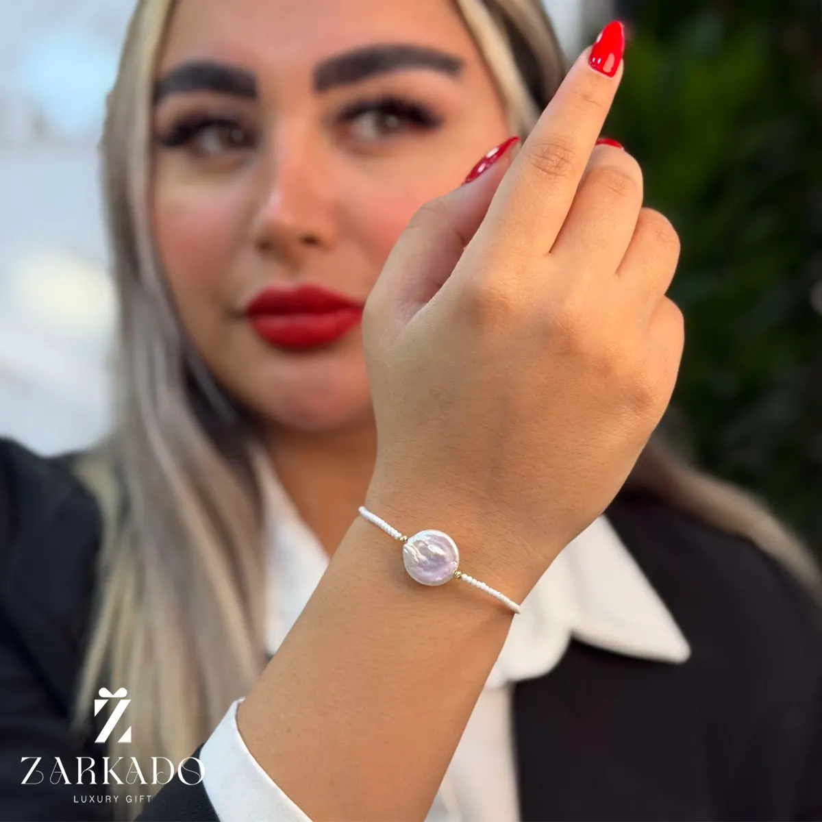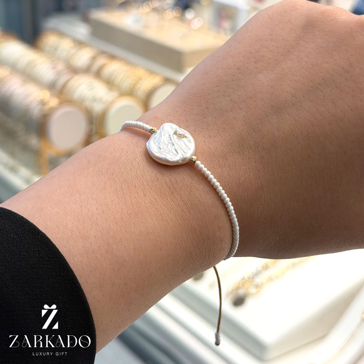 در مرکز دستبند، مروارید سفید طبیعی قرار گرفته است؛ مرواریدی با بافت طبیعی و درخشش صدفی که نماد پاکی، آرامش و اصالت زنانه است. این هماهنگی میان طلای زرد و مروارید سفید، ظاهری لوکس و در عین حال ساده و دلنشین پدید آورده است.