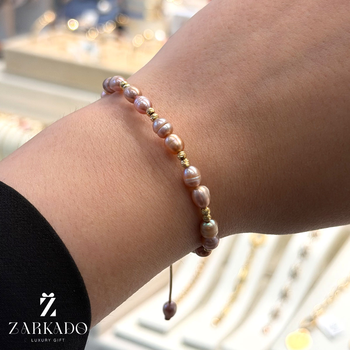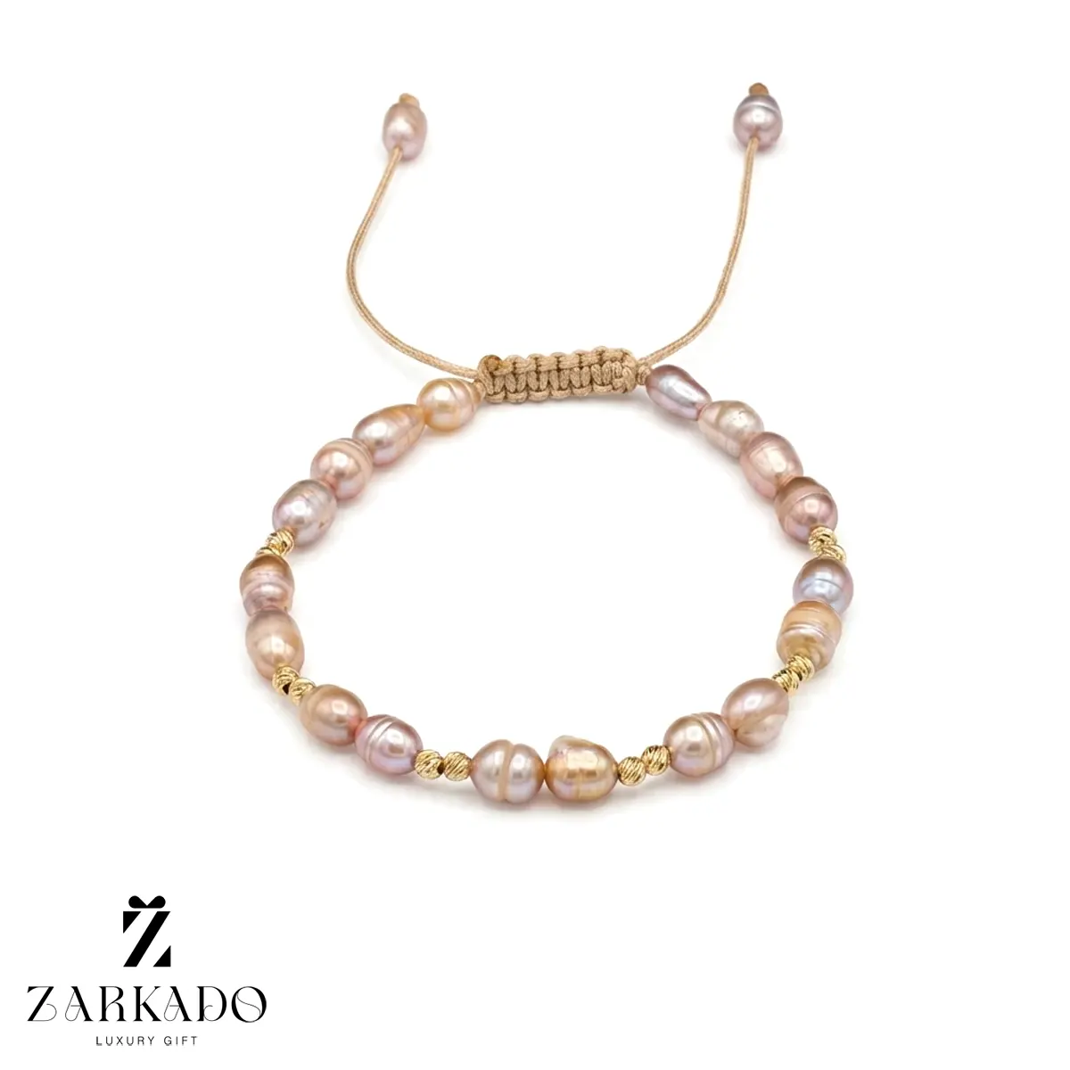 • این دستبند زنانه از مرواریدهای پرورشی با فرم طبیعی و طیف رنگی ملایم تشکیل شده که ترکیبی از رنگهای صورتی، کر رنگهای صورتی، کرم و یاسی در سطح براق آنها دیده میریف و متفاوت ایجاد میکند ✨