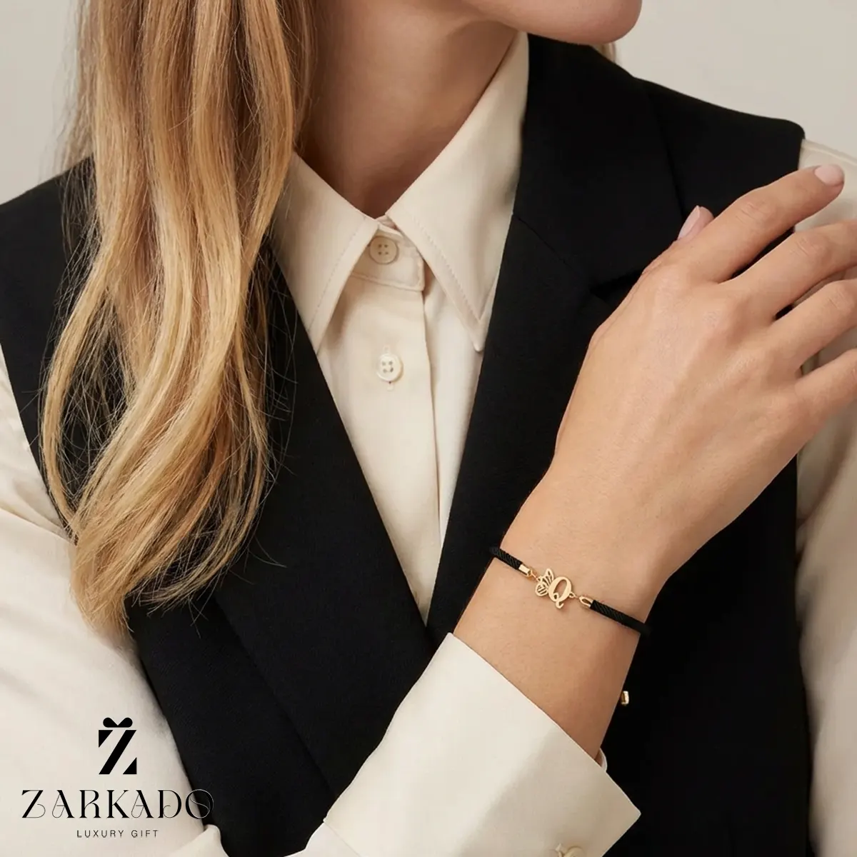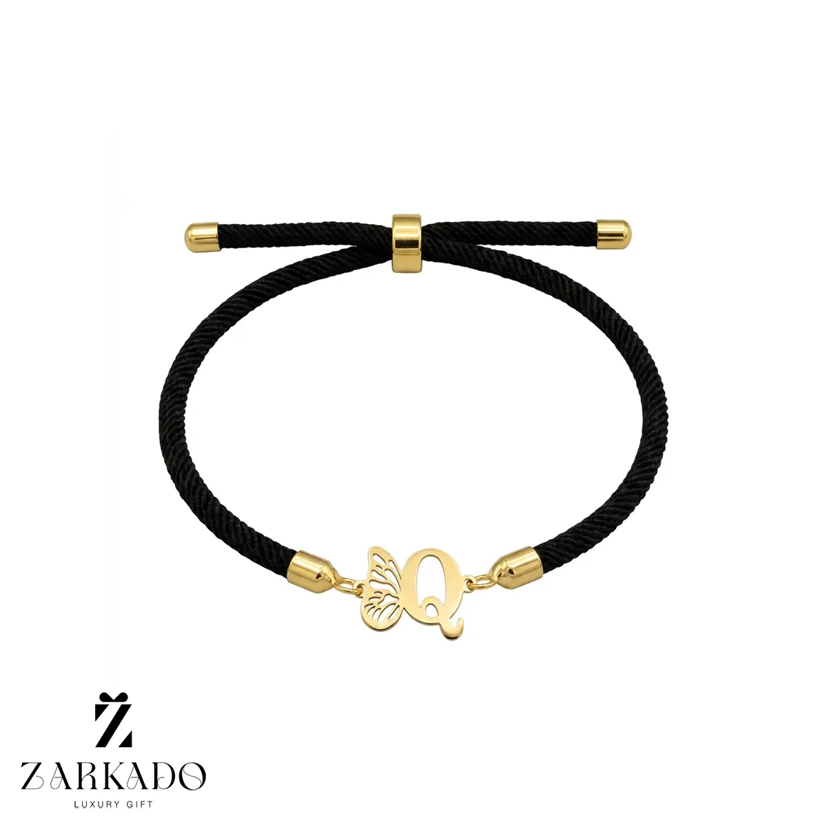 دستبند بندی با پلاک حرف Q با بال پروانه از جنس طلا، انتخابی ظریف و شیک برای استفاده روزمره یا هدیهای شخصی و ماندگار.