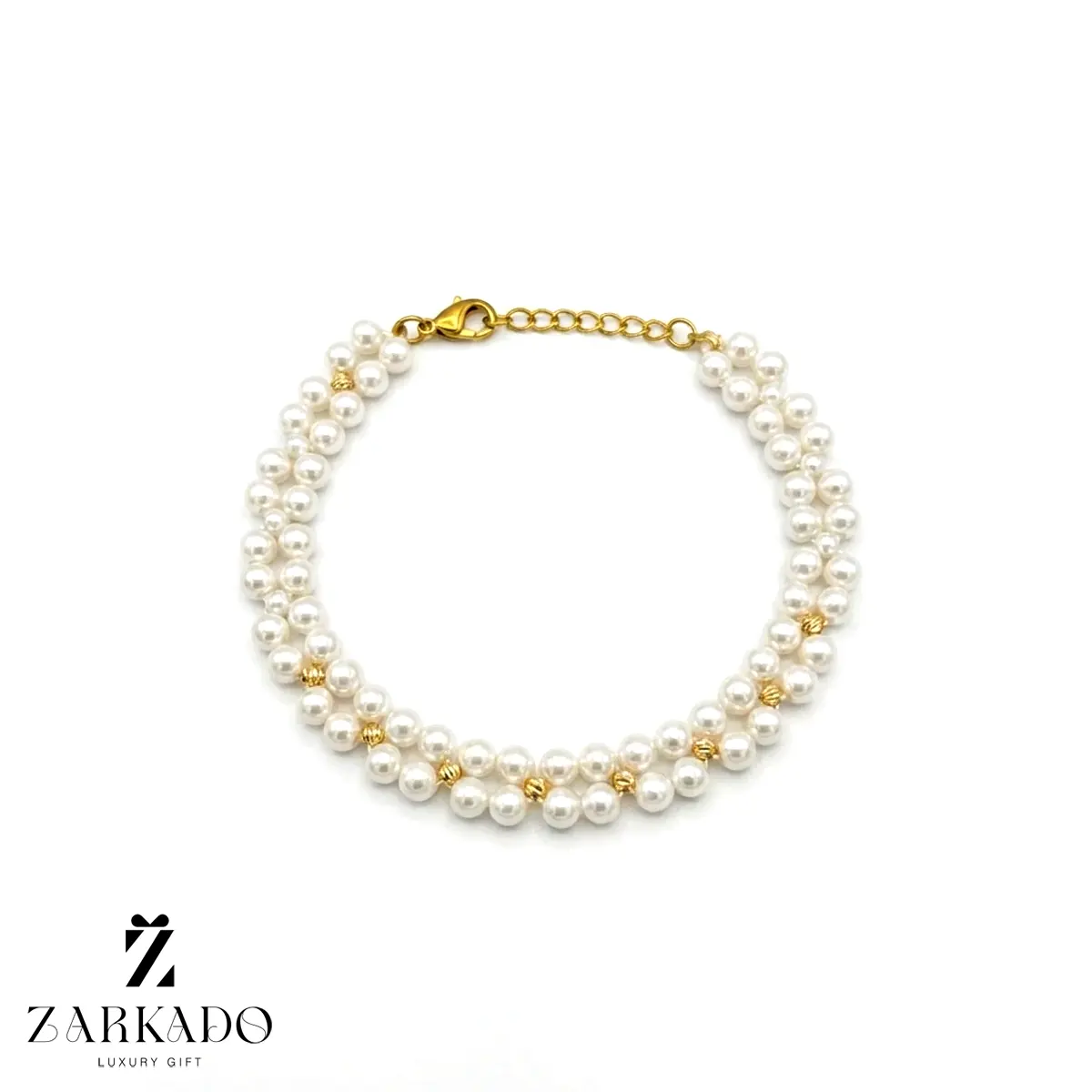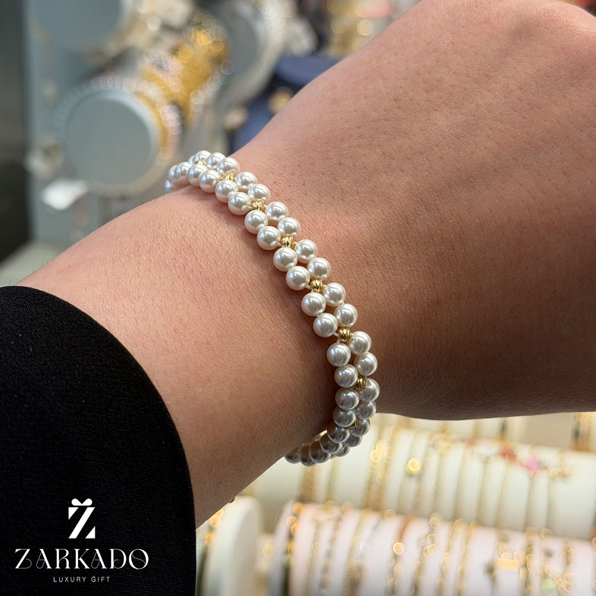 • این دستبند زنانه با ساختار دو ردیفه از مرواریدهای سفید طراحی شده که چیدمان منظم آنها جلوهای کلاسیک و هماهنگ روی مچ دست ایجاد میکند ✨