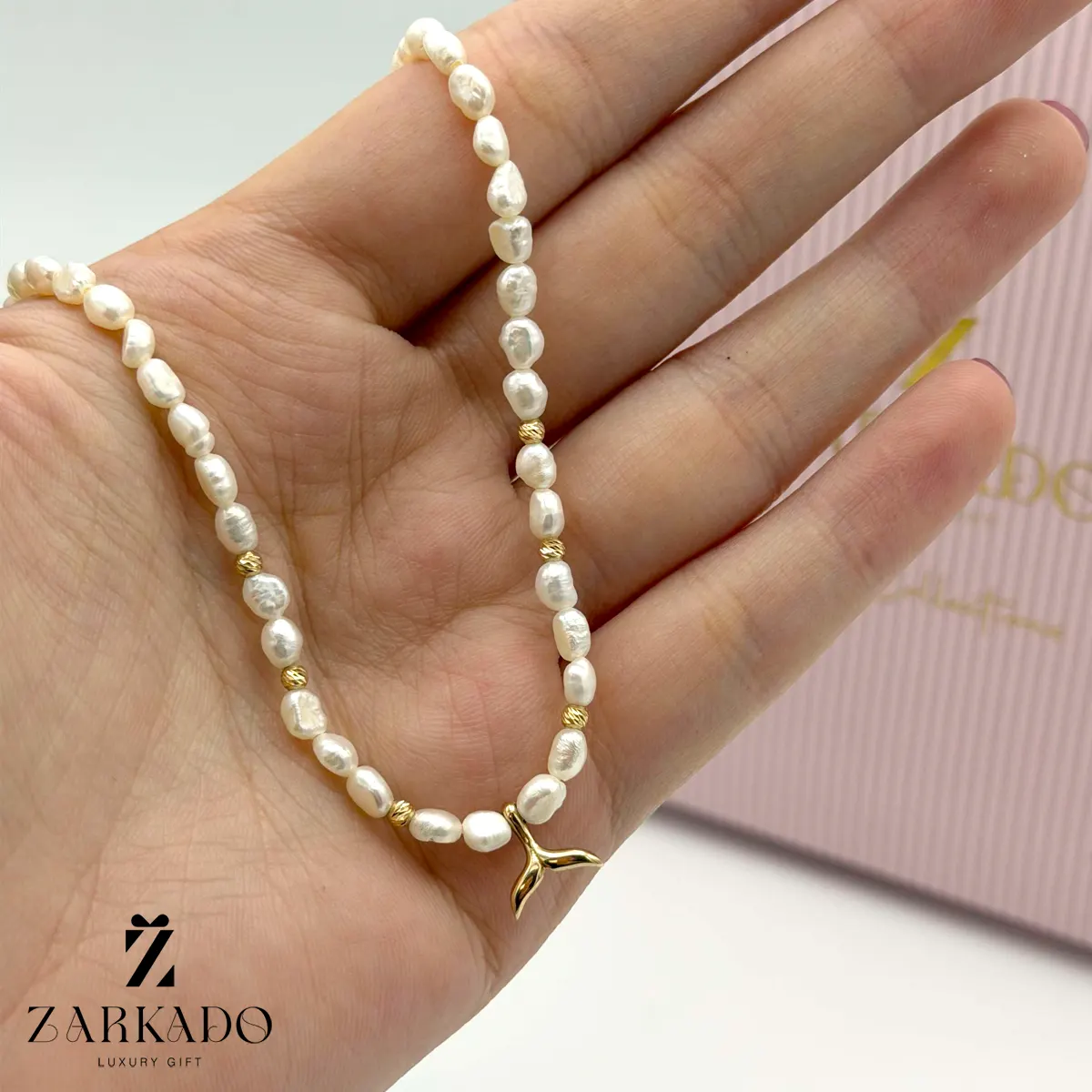 • در میان مرواریدها، گویهای البرنادو از طلای ۱۸ عیار قرار گرفتهاند که با سطح براق و فرم کروی خود، تضاد ظریفی با بافت نرم مرواریدها ایجاد کرده و جلوه بصری گردنبند را تقویت میکنند 💍