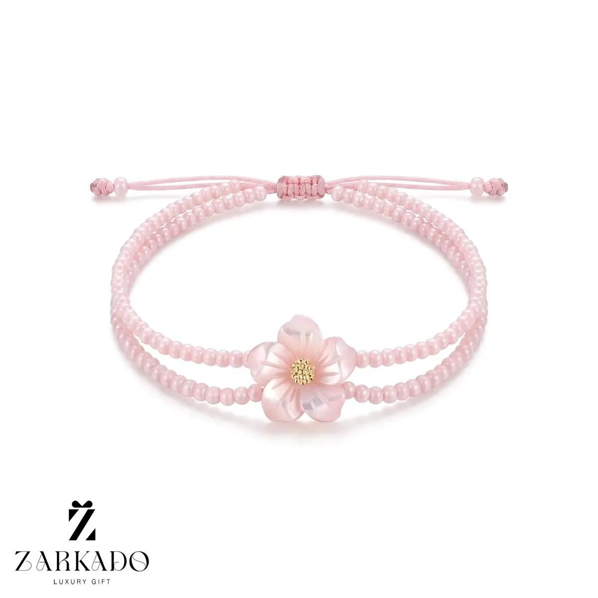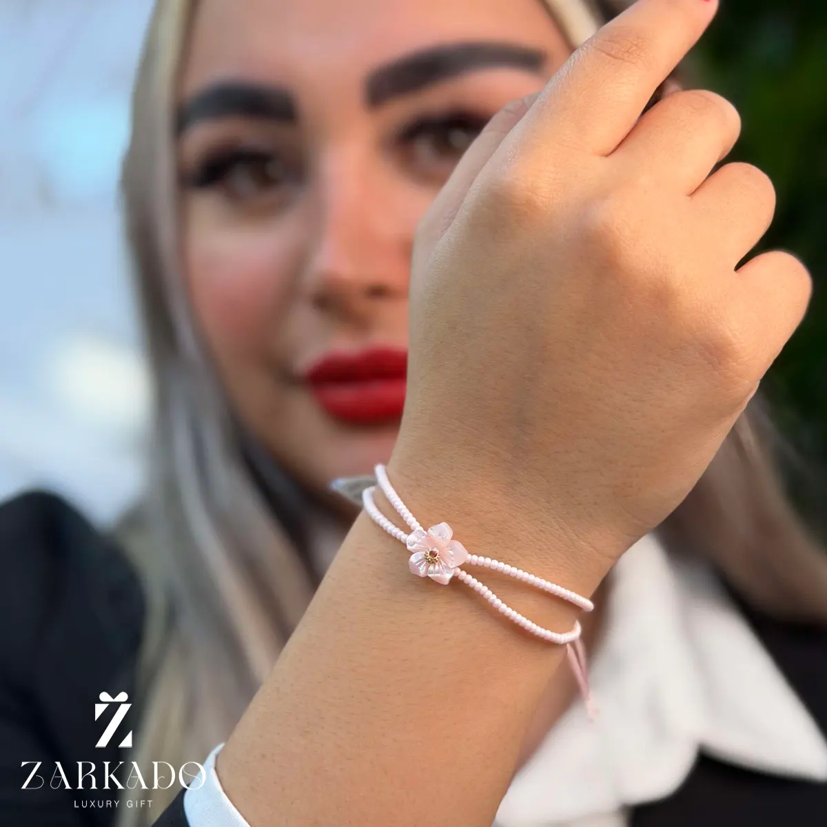 • در مرکز دستبند یک گل صدفی با فرم چندگلبرگی قرار گرفته که با سطح طبیعی و نیمهبراق خود زیبایی ملایمی به طراحی افزوده است 💍