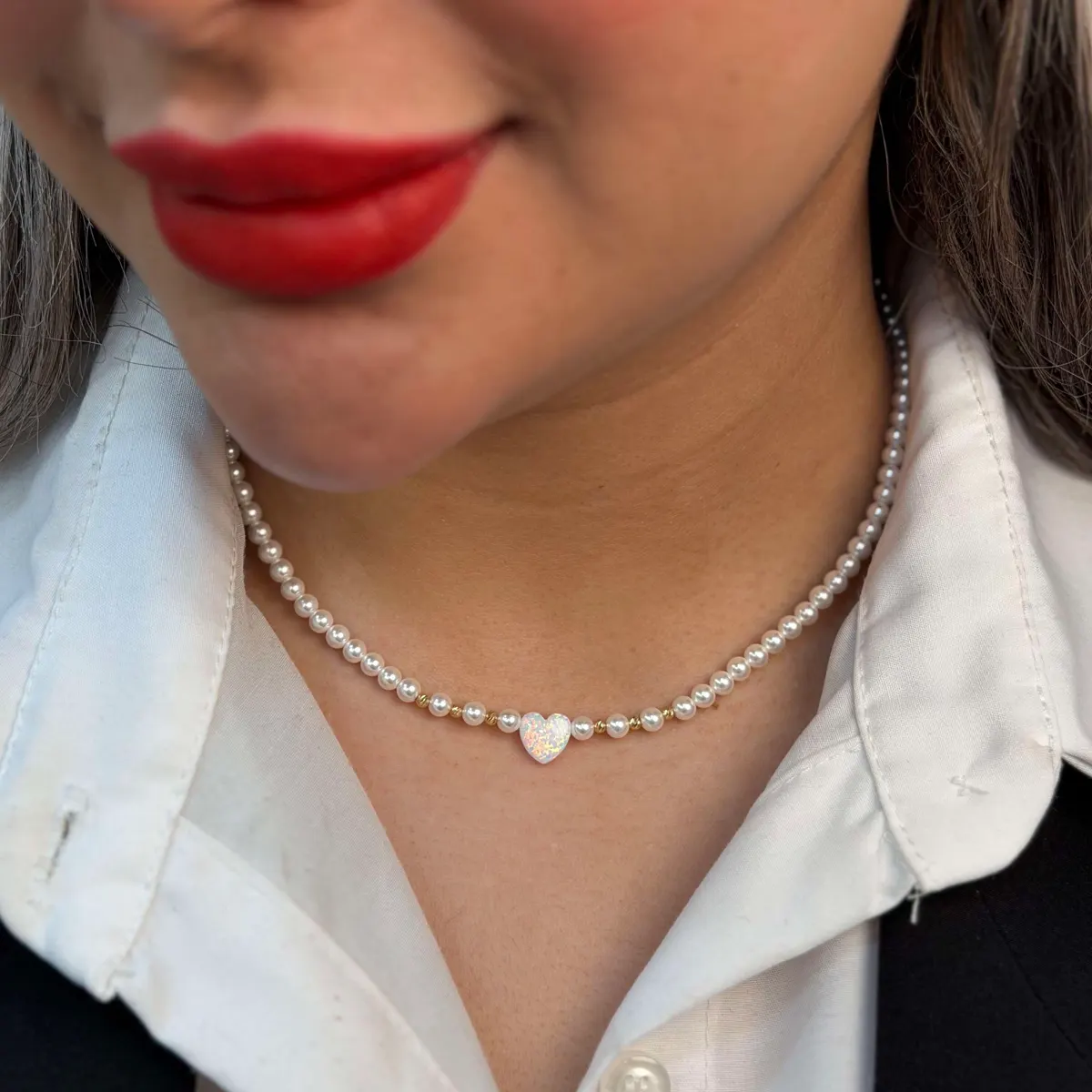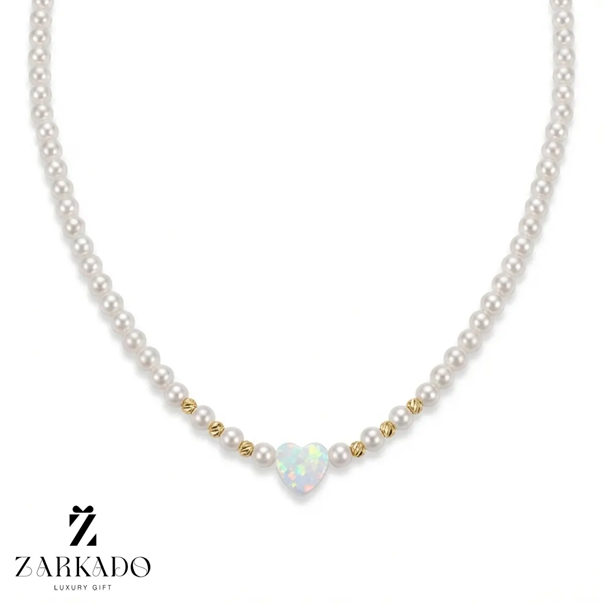 در مرکز طراحی، پلاک قلبیشکل با سنگ اوپال سفید قرار گرفته است؛ سنگی با درخشش رنگین و نرم که نماد عشق، آرامش و احساسات پاک است و به گردنبند جلوهای خاص و چشمنواز میبخشد.