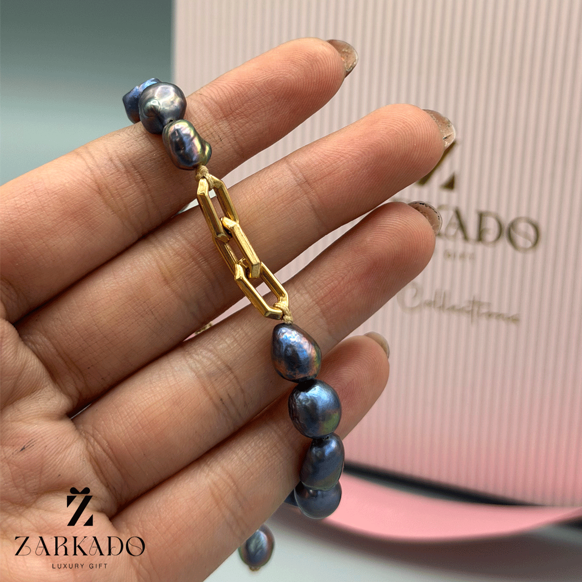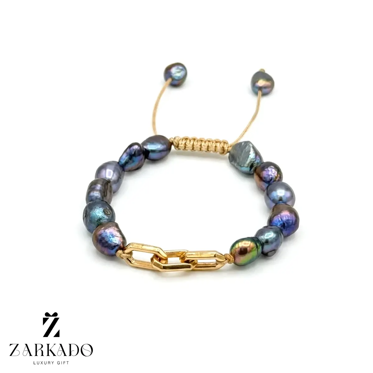 • مرواریدها دارای طیف رنگی چندرنگ شامل بازتابهایی از آبی، سبز و خاکستری هستند که در کنار یکدیگر جلوهای درخشان و مدرن به ساختار دستبند میبخشند 💍
