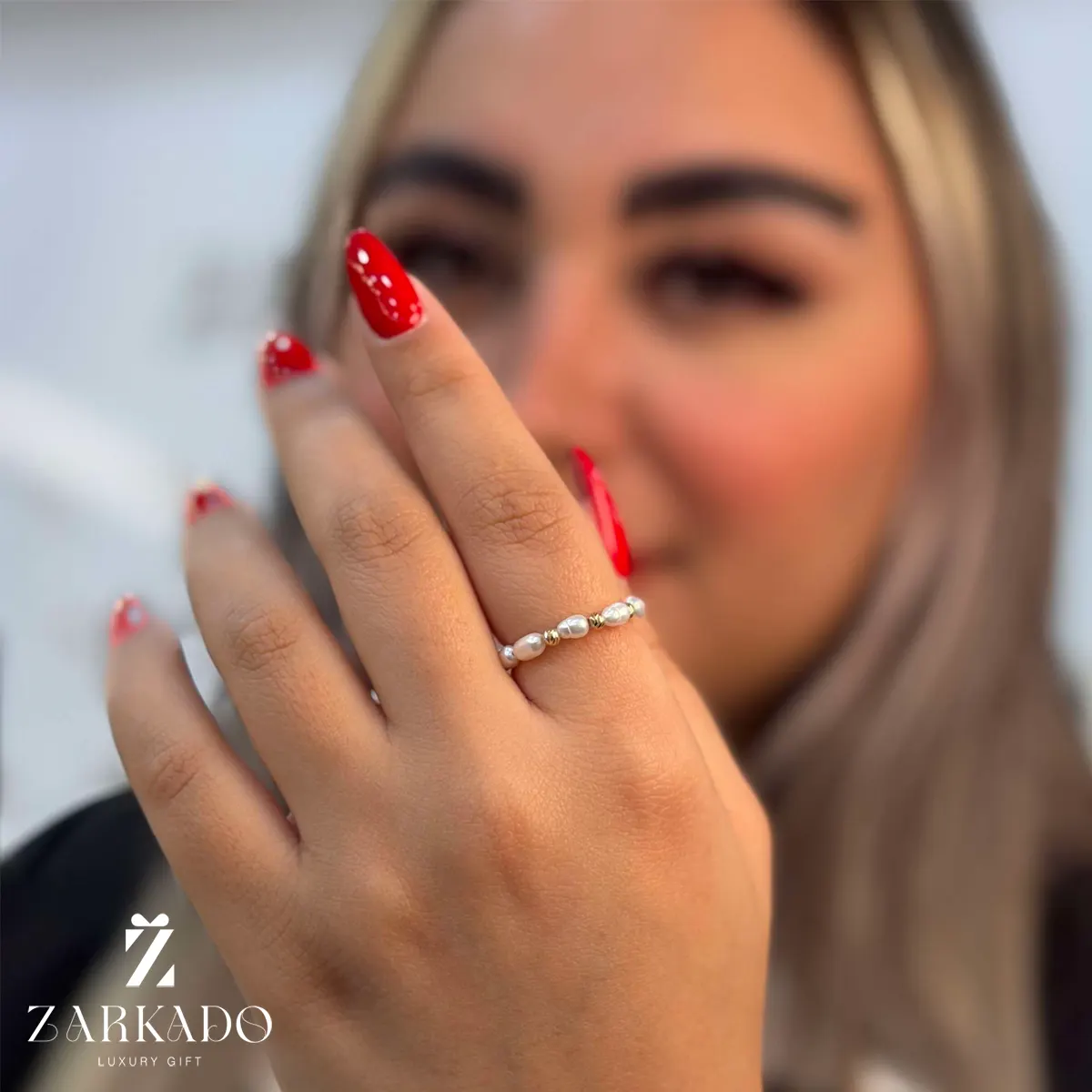 • چیدمان مرواریدها به صورت ردیفی و یکنواخت انجام شده و ساختار کشی انگشتر باعث قرارگیری راحت و فیت مناسب روی انگشت میشود 💍