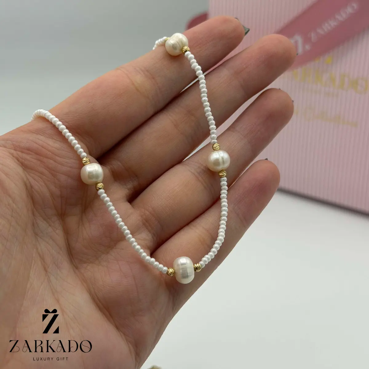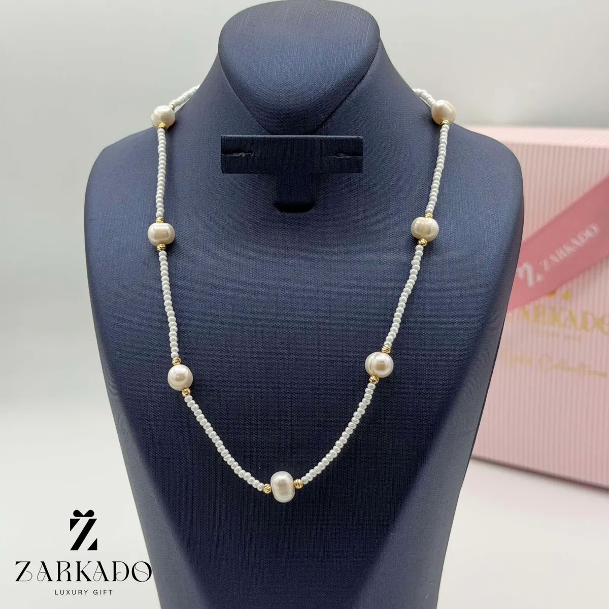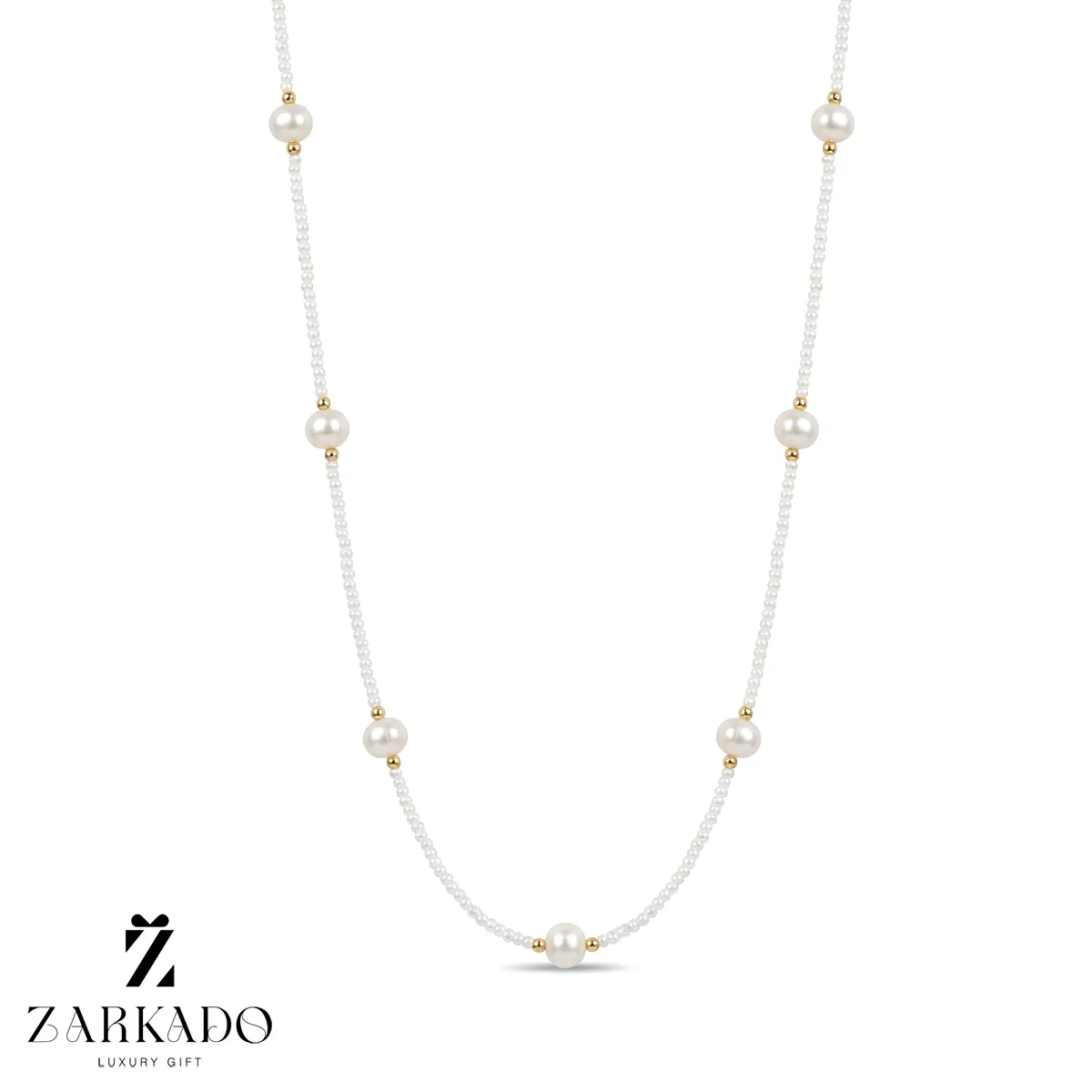 • در فواصل مشخص در طول گردنبند، مرواریدهای درشت با سطح صیقلی قرار گرفتهاند که بهعنوان عناصر شاخص طراحی عمل کرده و ریتم بصری متعادلی در کل ساختار گردنبند ایجاد میکنند 💍