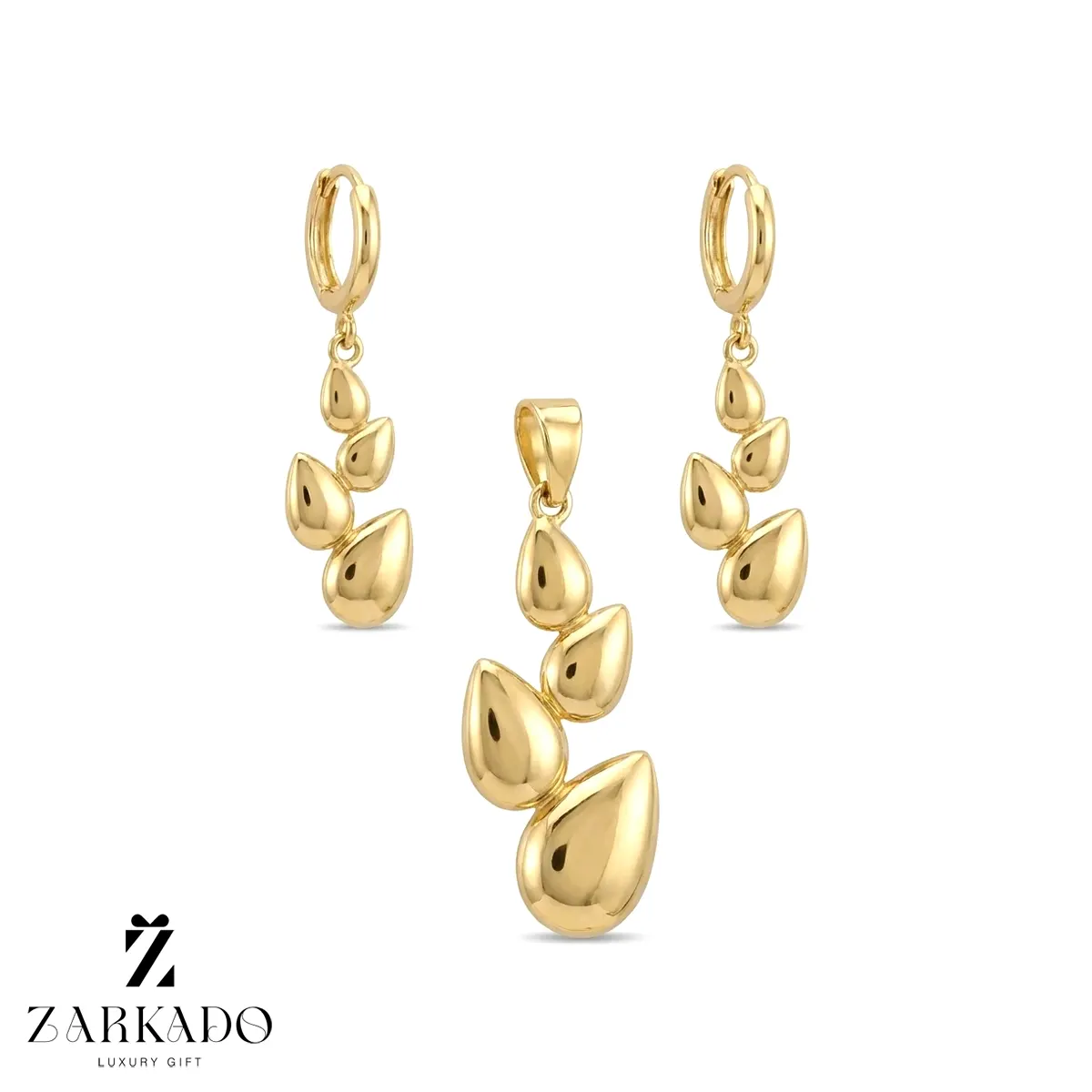 این نیمست از طلای ۱۸ عیار ساخته شده و شامل یک جفت گوشواره آویز و یک پلاک طلا با طراحی مبتنی بر عناصر اشکی حجیم است؛ هر قطعه دارای سطحی براق، صیقلی و کاملاً یکپارچه بوده و انعکاس نور روی آن جلوهای لوکس ایجاد میکند ✨